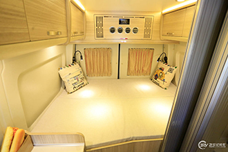 标准版采用车尾上下铺布局,上铺不使用时还可将床板向下翻着,当做靠背使用。