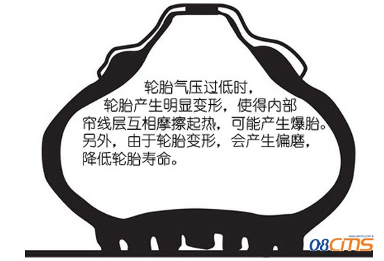 胎压过低时轮胎会发生明显的变形,使得胎肩甚至胎侧接触到地面。这些本不该与地面接触的部分是轮胎较薄弱的部分,若一定时间的与地面摩擦则会发生爆胎。另外,轮胎气压过低时轮胎内部的帘线层之间会产生摩擦从而产生大量热量,使轮胎加速老化造成爆胎。