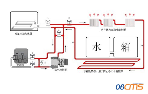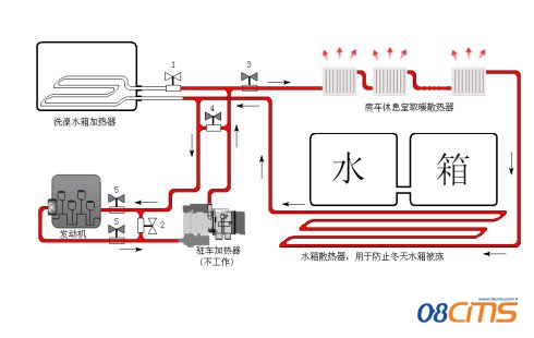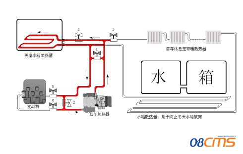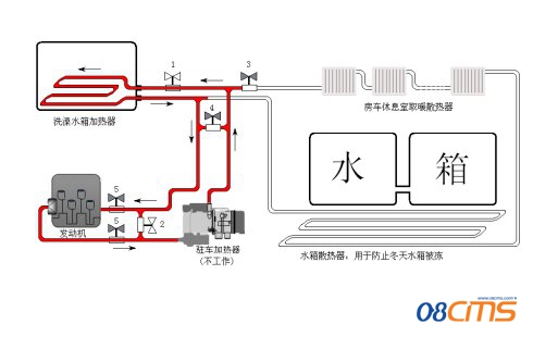 驻车加热器加热防冻液,被加热的防冻液由水泵送往散热器,防冻液通过散热器散热使房车内的空气温度升高。留有余热的防冻液流到水箱房东系统,通过散热器或金属管来为水箱仓加热来维持空气的温度,从而实现了防冻功能。