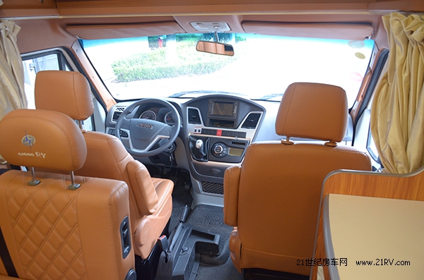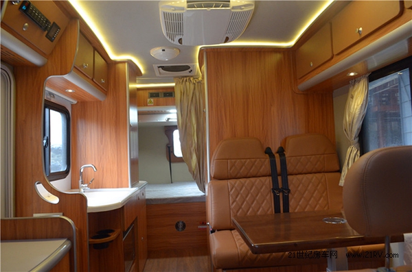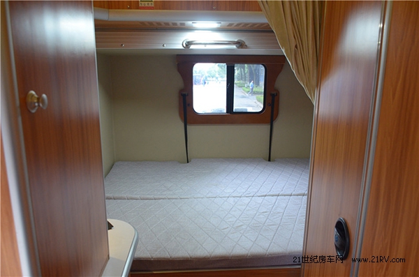 休息区:双人卡座可变床(1.8MX1.2M),尾部抽拉式双人床2.1MX1.3M、行驶时可作沙发。驾驶舱顶部翻转床(2.1MX1.3M)可同时满足6人睡眠;