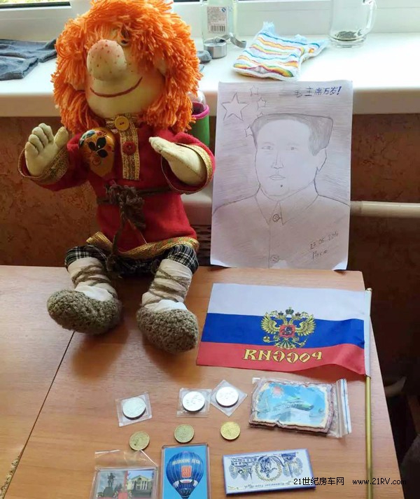 把时间拉回到2016年5月28日,北京蝈蝈在俄罗斯认识一个小伙子,了解后得知是中国来的,于是小伙子要求他们到家里做客,由于怕给他们添麻烦就没有去,下午小伙子带了五个好友到宾馆看望他们,并且带了些礼物,有地方标志的纪念币、旗帜和漂亮的冰箱贴,可爱的布偶是一个小美女自己动手做的。他们唱了俄国歌曲,然后让他们唱中国歌,想了一会还是唱俄罗斯歌曲容易共鸣。他们先哼起莫斯科郊外的晚上把孩子们高兴坏了,一起随唱。他们又唱起喀秋莎,整个房间充满了歌声和笑声。