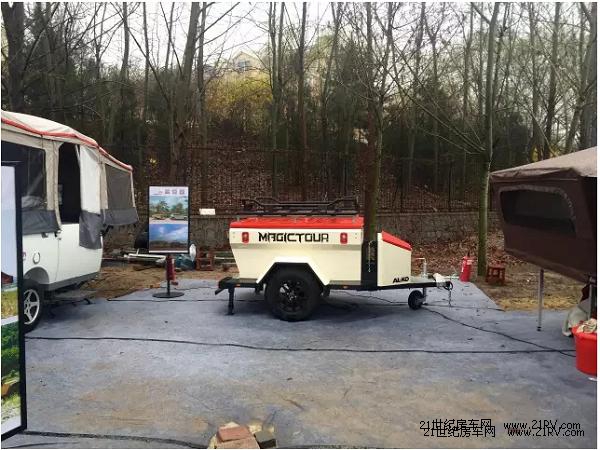 前部是摩托车,拖挂房车在后面,这类房车的重量都很轻。经过现场询问厂商,得知此类挂车不需悬挂牌照(重量及长度需在国家标准以内,根据厂商给出的答复是重量小于300kg的小型拖挂式旅居车不用悬挂牌照)。