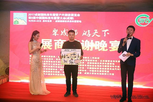 就在活动开幕的第一天,主题为“聚成都·游天下”展商答谢晚宴在房车世界·棕榈世界房车露营地顺利举办,为了答谢展商对于展会的支持,10月20日晚,上百家参展商欢聚一堂,共同庆祝这一年底的房车行业盛宴。晚宴开始之后,由成都市郫都区副区长吴红艳女士和21世纪房车创始人兼CEO王继东先生致欢迎词,欢迎在场的参展商汇聚成都,“聚成都·游天下 玩房车·来友爱”,并且预告晚宴期间会给各位带来极具成都特色的精彩节目。