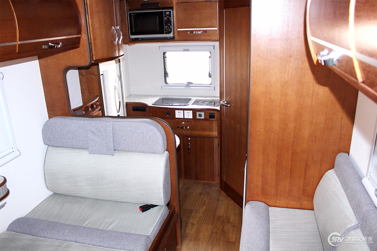 这款哆啡C8房车在内饰布局上较之此前的两款房车变化很大,厨房区和卫生间的后置且取消了车尾床,加大了厨房和卫浴间的可用空间。虽然是双床位布局,额头床依然保持了2180*1500(mm)的尺寸,供两个成热休息毫无压力。