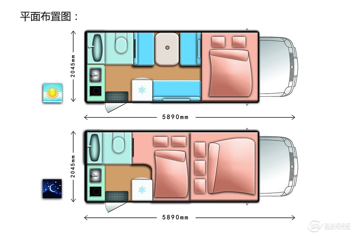这款览众C5房车的内部布局为前置额头大床+中部拼接床+后置厨房区+后中置卫生间,中部通过卡座沙发的拼接可组合变成一张容纳2人休息的大床,尺寸也非常可观。配置方面,120Ah生活电瓶、300W逆变器、71升车载冰箱、24寸液晶电视机、冷热水淋浴器、电磁炉、DVD音响系统、220V顶置空调、便携式坐便器、换气扇等设备。