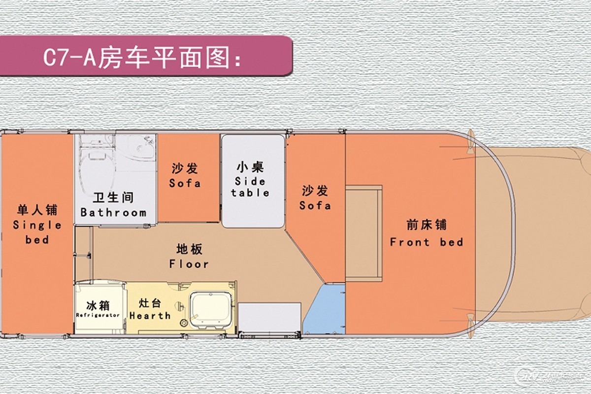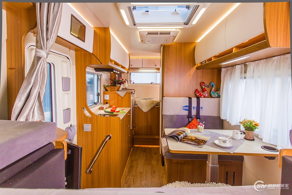 内饰采用了木质纹路的板材,配上暖色调的LED灯光,很温馨。前驾驶室上方是一张双人床,尾部是一张横置的单人双,沙发也可以拼成一张床铺,可以满足3口之家、4口之家的出门旅行。厕所、厨房、空调都有配备。27.88万的亲民价格也让这款车能在众多房车的竞争中脱颖而出。