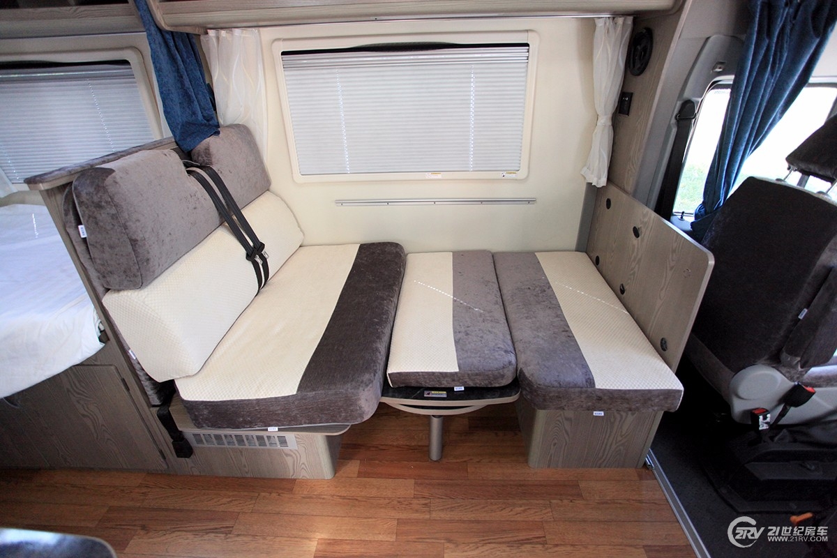内饰方面,这款览众赛拉维C款房车车厢两侧都有顶置储物柜,装载能力较强。大理石纹桌面的升降桌提升了装修格调的同时也与整车配色风格相呼应,更增房车的沉稳、庄重,除此之外升降桌还能与卡座沙发拼成床铺,与额头双人床、车尾纵置双人床一起组成2+2+1的床位布局。厨房和卫生间位于车厢后方,厨房的双眼燃气灶提高了烹饪效率。