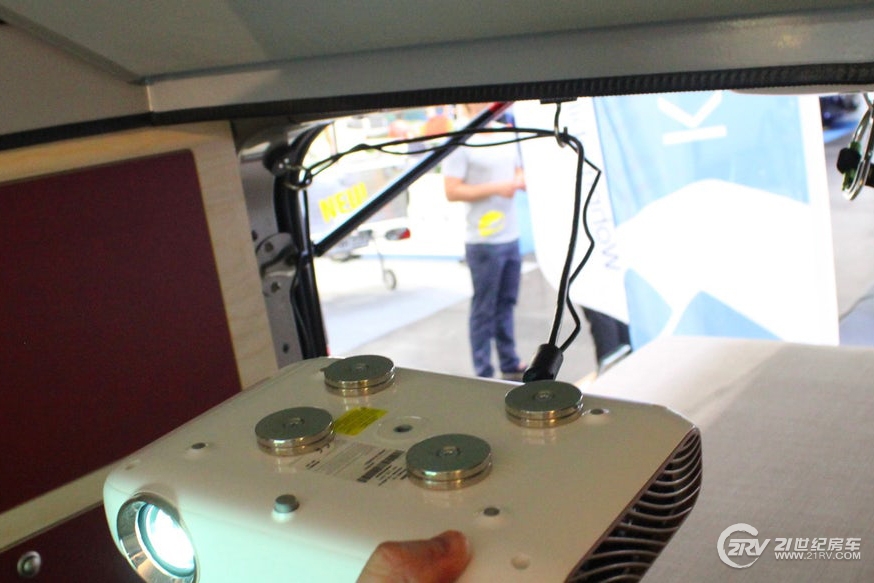 这款露营车深得一些喜欢户外的年轻人喜爱,原因在于这款车充当了一个移动电影院的角色,该车采用了一项叫“Bus Kino”投影系统的新功能,说得简单点就是搭配了一个简单,多功能的磁性LG投影仪和双面显示屏的组合。投影机和屏幕可以在露营车周围移动,投影机安装在升降顶床位的下侧,升降顶弹出的时候侧壁作为投影墙使用。这种设置在床上,在车外都能看电影。