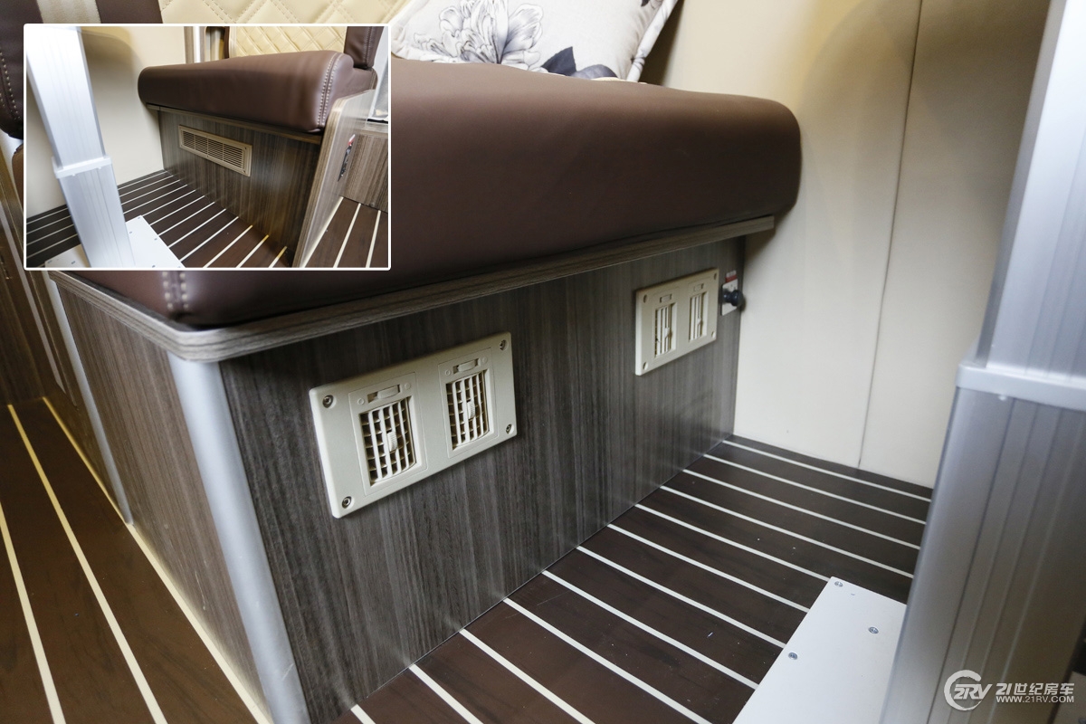 另一侧卡座沙发上方空间则安装了一台行车空调,主要考虑到车辆行驶过程中为沙发区乘客也带来舒适的车内温度。