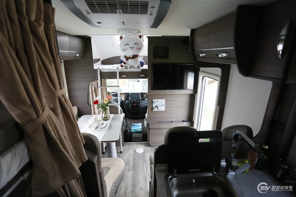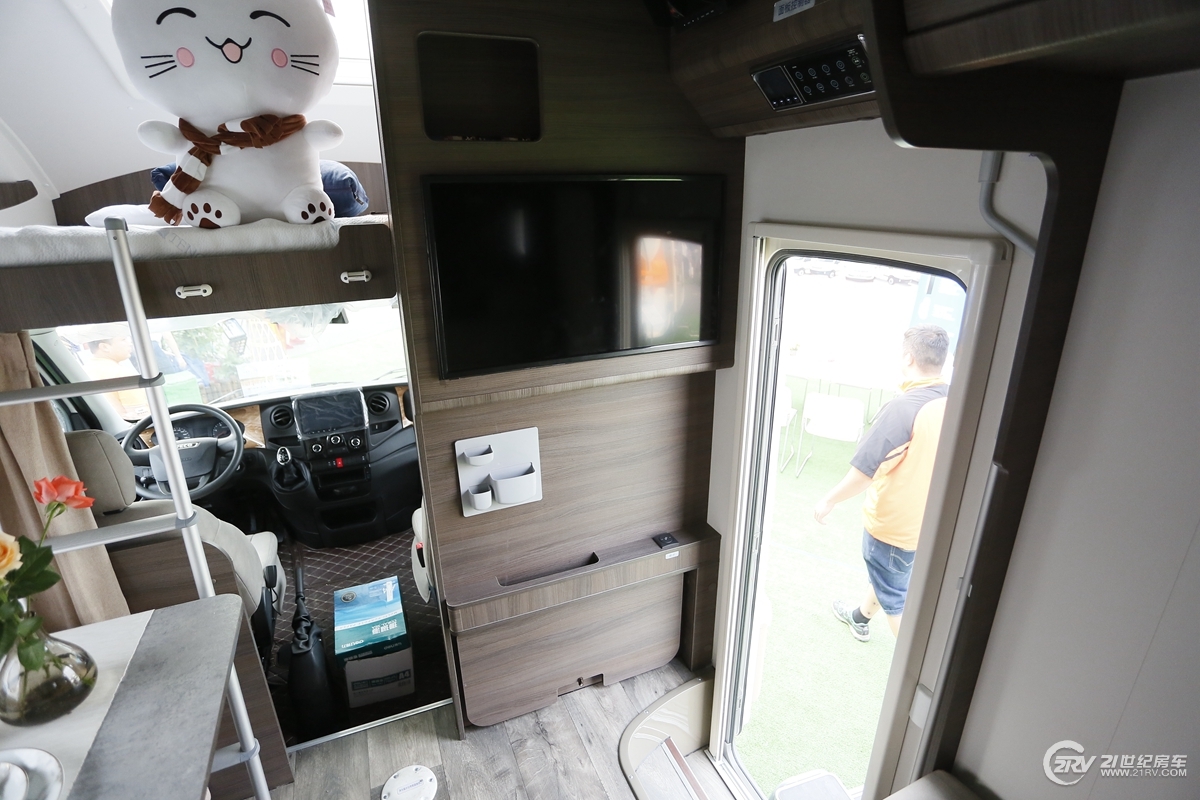 驾驶席和生活区是属于半贯通式的设计,副驾驶席后面做了一个类似于屏风的挡板,将电视机嵌入在了这里,电视机通过后面的旋转支架进行位置旋转,看电视也更方面一些。坐在卡座上能看到,在后面床上也能看到。