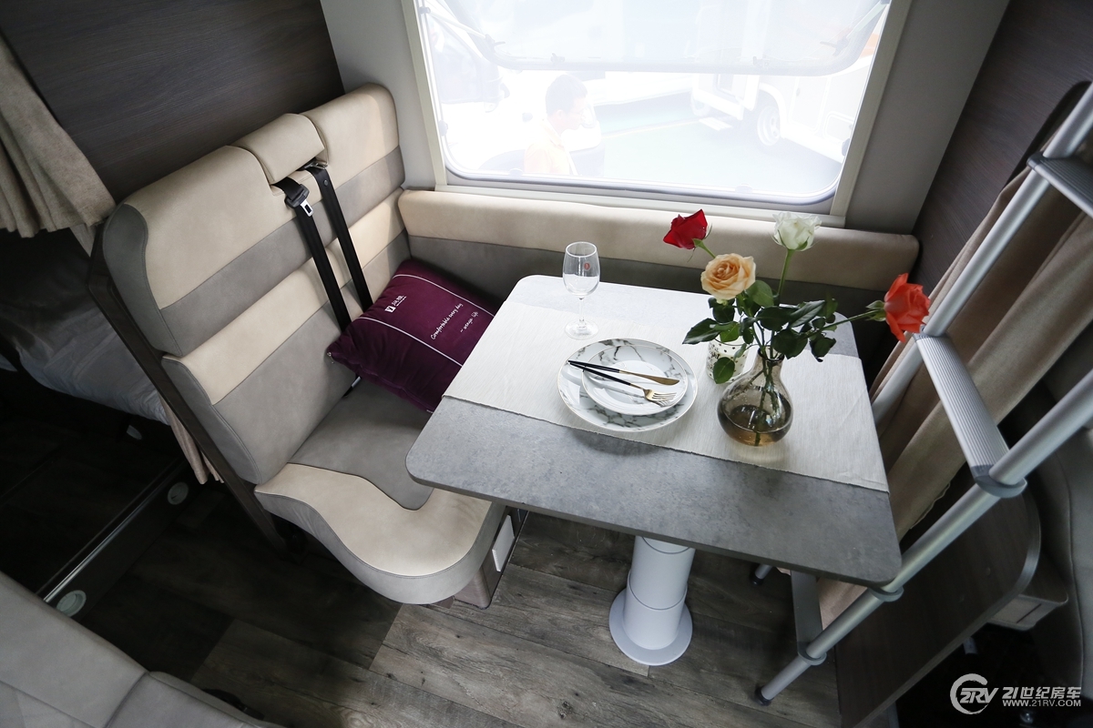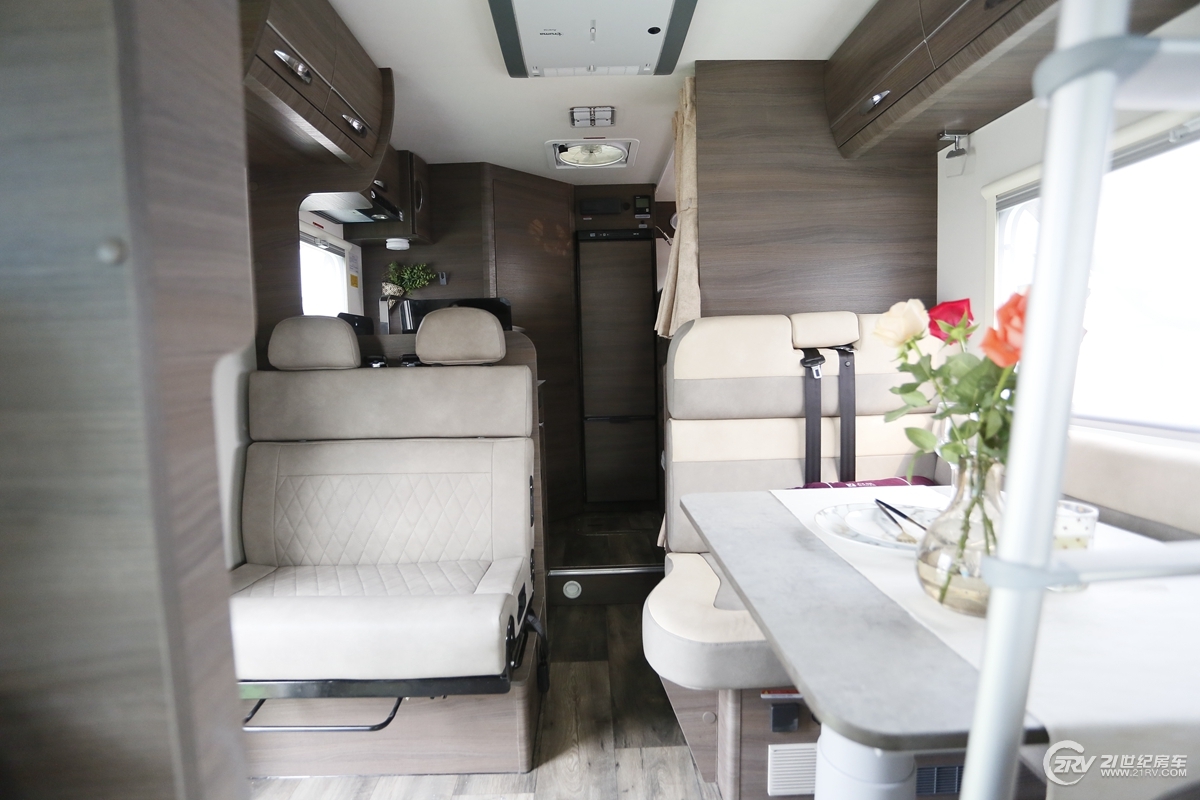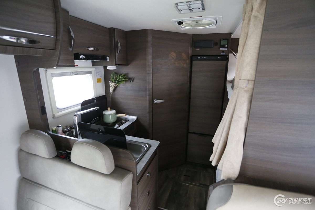 旌航WH-593-III内饰还是非常具有质感的暗色实木材质,整体的布局为额头双人床2000×1400(mm)+车尾高低床+会客区+厨房。这款车型的布局对于旌航房车来说,已经不是第一次尝试了,曾经在其他底盘上也曾改装过。这款车的客厅区域增大了餐桌的面积,继而做成了单排卡座,为了满足6人同时乘坐,另外一排卡座则放到了车厢中门附近。尾部的区域是卫生间,高低床和卫生间。为了让车厢外侧的储物空间足够大,车尾地板的高度进一步抬高。
