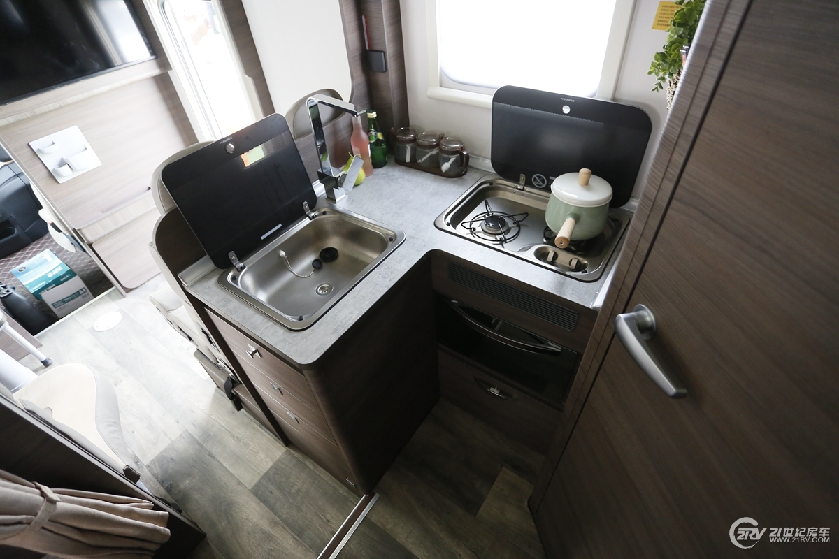 当你看过了许多房车的厨房的时候,你会发现“L”型厨台的操作更顺手,这也是为了减少占地面积而作出的折中选择。一体式橱柜台面上单独设有不锈钢水槽和燃气灶,不锈钢水龙头的高度也非常合适,不至于用器皿接水的时候伸不进去。燃气灶只有2个,热饭的时候不至于两个锅互相“挤兑”。旌航在细节上下的功夫确实不少,靠近卫生间的位置是一台立式141升赛特福德三能源冰箱。