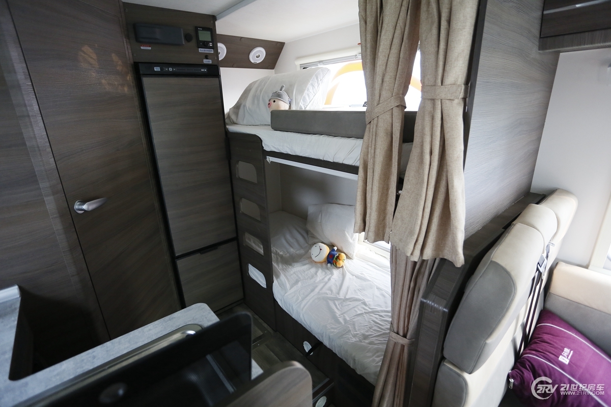 车尾的高低床尺寸为1900×700(mm),高低床一侧也开设有外推窗,透光性不错,通风换气得到了保证。高低床的布局更适用于稍微年轻的群体,上下床毕竟对于老年人来说,并不是特别的方便。