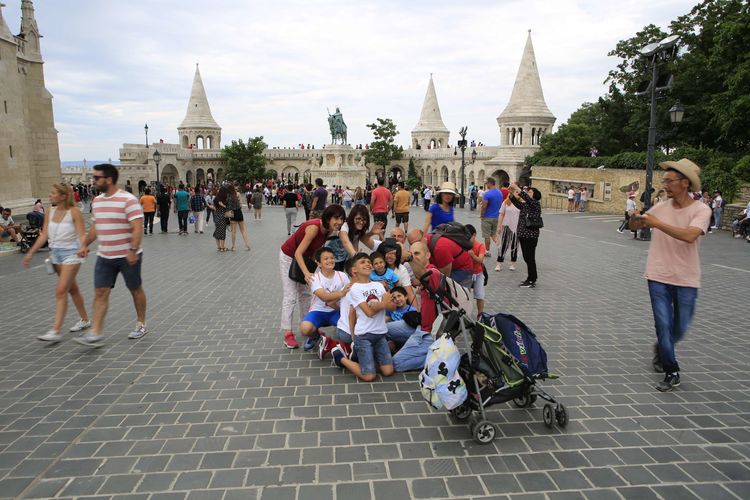 车友随遇而安在渔人堡广场拍摄游客合影