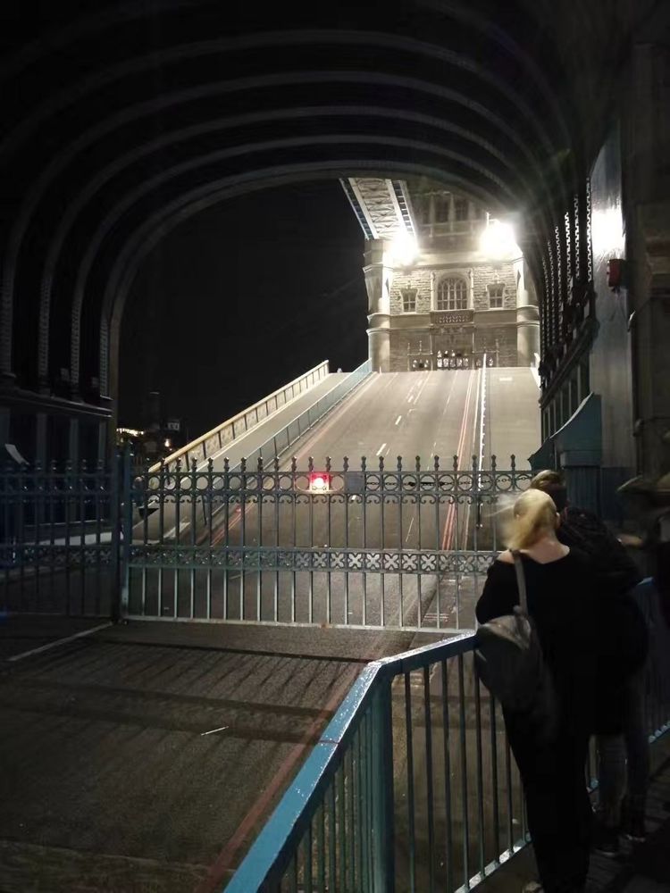 伦敦塔桥,当桥下有轮船通过时,桥梁关闭。巨大的路面缓缓升起。