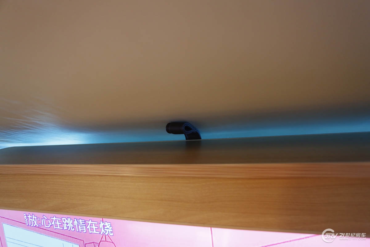 额头床底部集成有车载电视,将床板向上翻起后可供会客区乘客观看,车载电视与外置电视一样为40英寸,打开卡拉OK后同样可将画面投射到此电视上。