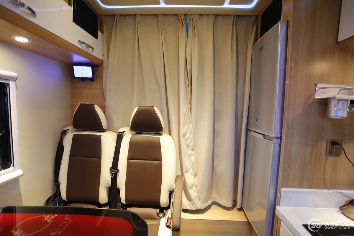 驾驶室与生活区之间设有隐私帘,与大部分C型房车不同的是,驾驶室隐私帘与额头床隐私帘集合成了一个落地帘。