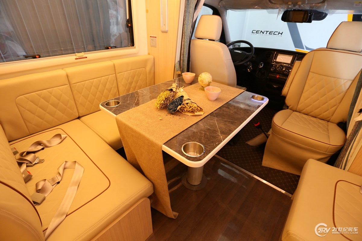 中天新季风T型风尚款房车的内饰继承了中天其他车型的设计元素,浅色的家具板材和座椅搭配暖色的灯光,给人的感觉一如既往的精致。驾驶室上方小额头区,周围是一圈储物空间,下方是一台32寸液晶电视。会客区采用L型纤维皮革沙发卡座设计,中间是可升降餐桌,车尾是纵置双人床。总体而言,这款车整个内饰从色调搭配到家具板材的选用再到灯光的配比,都足以展现中天制造的工艺水平。可升降的双人床是一大亮点,尺寸为1950×1400(mm),床位可以降到一个很低的高度,床位上方可直起上半身,因此不会感到压抑。