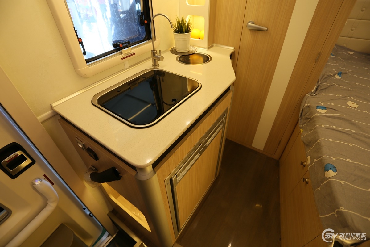 厨房区的操作台面紧凑,上面有带盖板的洗菜池和电磁炉,上方的吊柜中有一台微波炉,橱柜内是一台嵌入式80升多美达冰箱。卫生间内配置有赛特福德马桶、不锈钢洗手池、淋浴一体抽拉式水龙头和毛巾架。其他配置:该车标配360Ah铅酸电池、300W太阳能电池板、140升净水箱、70升灰水箱、埃贝赫2200W燃油暖风机、宏都顶置空调、多美达吸油烟机、美的微波炉、外置24寸液晶电视、外置燃气灶、卫星天线等。