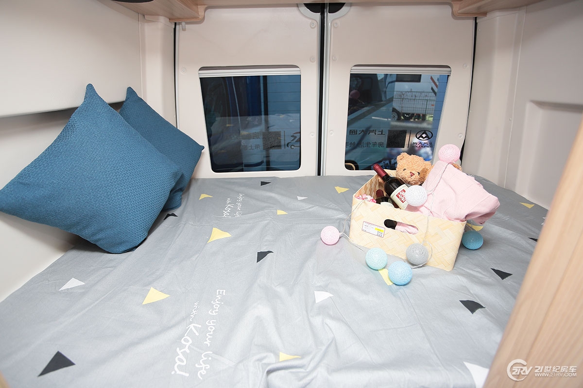 驾驶舱与车厢采用布艺拉帘进行了软隔断处理,既保证了通风采光又保证了车厢空间的私密性。房车额头处是一台液晶吸顶电视,供娱乐使用。正副驾驶座椅可以旋转,与车厢的升降桌、卡座沙发组成会客区。车门上方是科技感十足的触控式总控制板,左侧是厨房区。一体式橱柜电磁炉、洗菜盆、水龙头等设施齐全。车尾是卫生间和横纵置床,卫生间内抽拉式盒式马桶、换气扇等设备完善。车尾床由储物柜式床身和折叠式金属床板组成,平时金属床板折起可以提升房车空间,休息时放下床板铺设被褥用于睡眠。