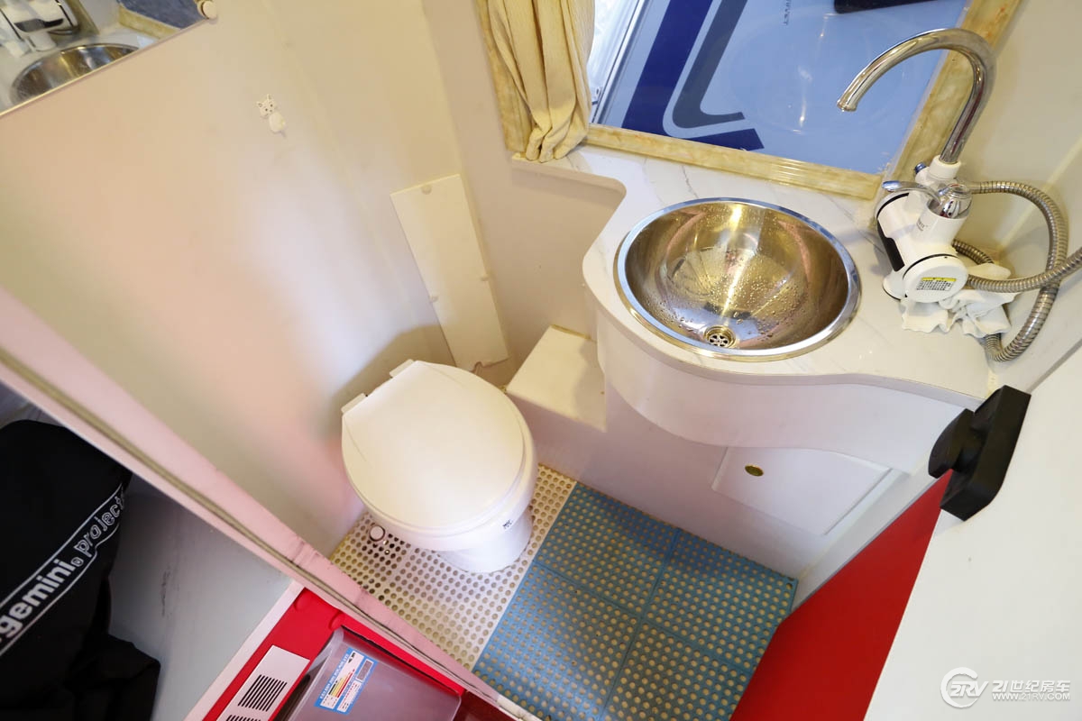 作为一款B型房车,卫生间空间还算充足,内部配备有房车专用座便器,可选配电动粉碎座便器,洗手池及淋浴器也一应俱全。水路方面,新车净水箱容积提供70-150升可选,灰水箱容积为60升。