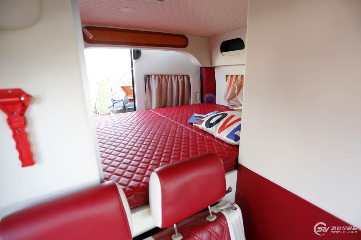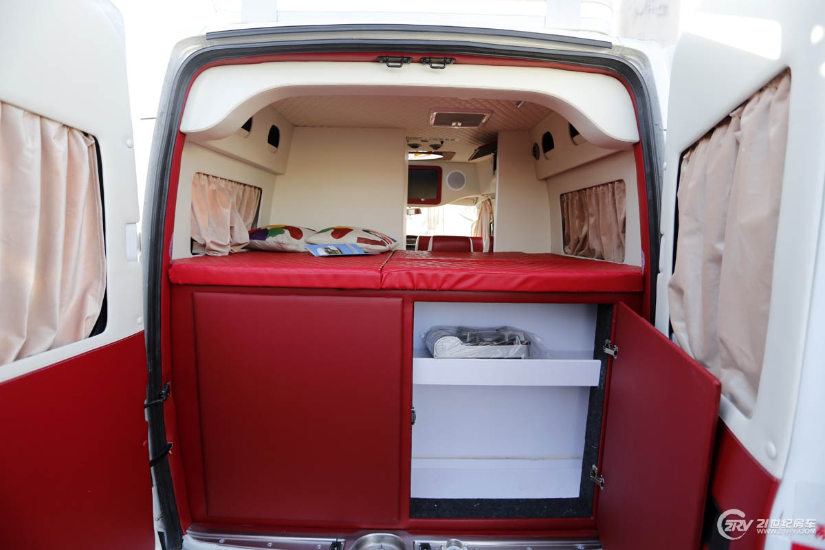 新车采用电动升降床位布局,车厢中部为对坐式卡座沙发,厨卫区布置在车尾。