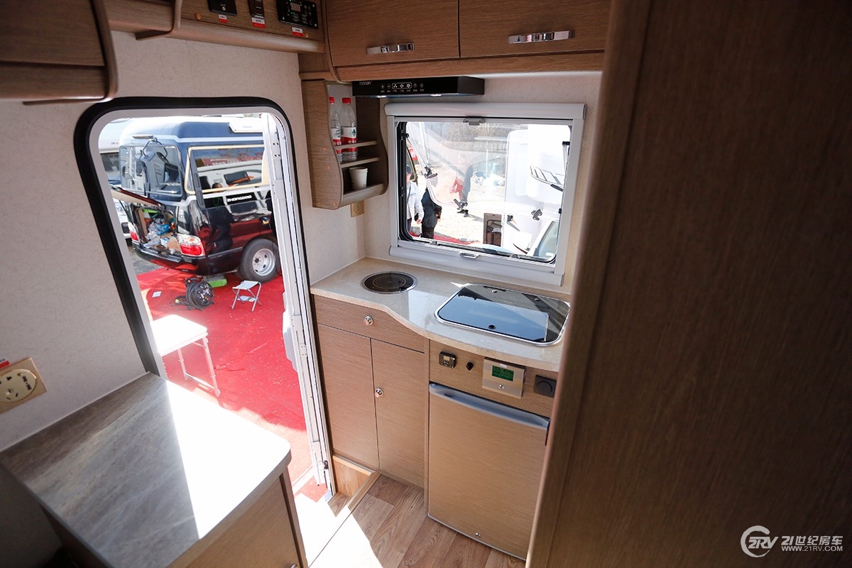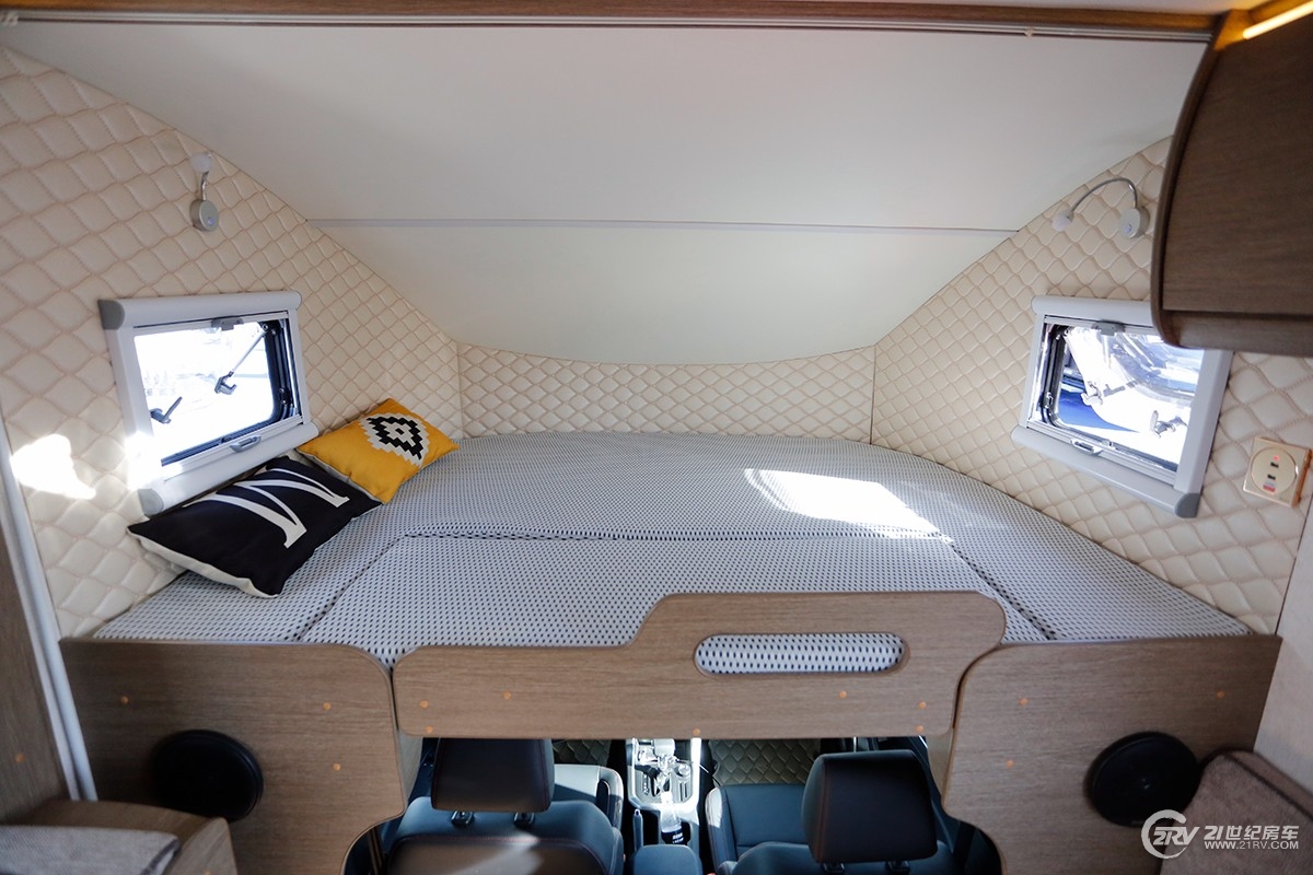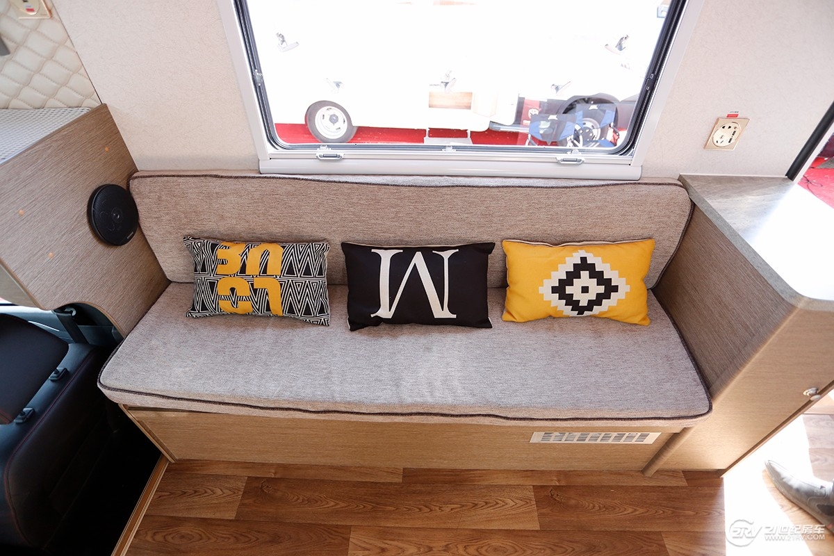 皮卡房车最大的优势在于车身紧凑,通过性强,但是内部的空间活动区域要比其他自行式C型房车小。也因此,在皮卡房车内一款好的布局起到至关重要的作用,这款皮卡房车则采用的是额头大床+横置沙发+双人对座式卡座+后置厨卫的格局。大部分居住的空间集中在车身的前半部分,而后部为上下车的出入口和卫生间以及厨房。另外,为了增加车内的居住人口,侧方的横条沙发可以转换为床铺。