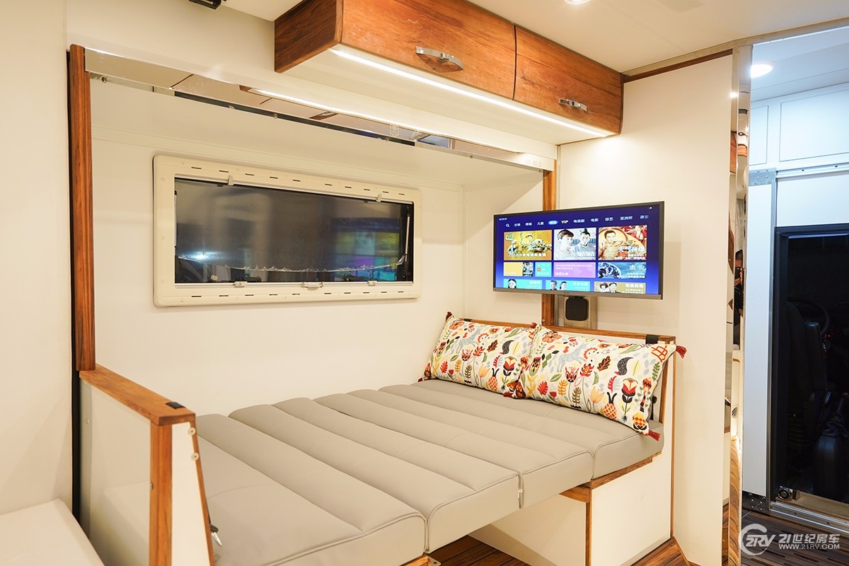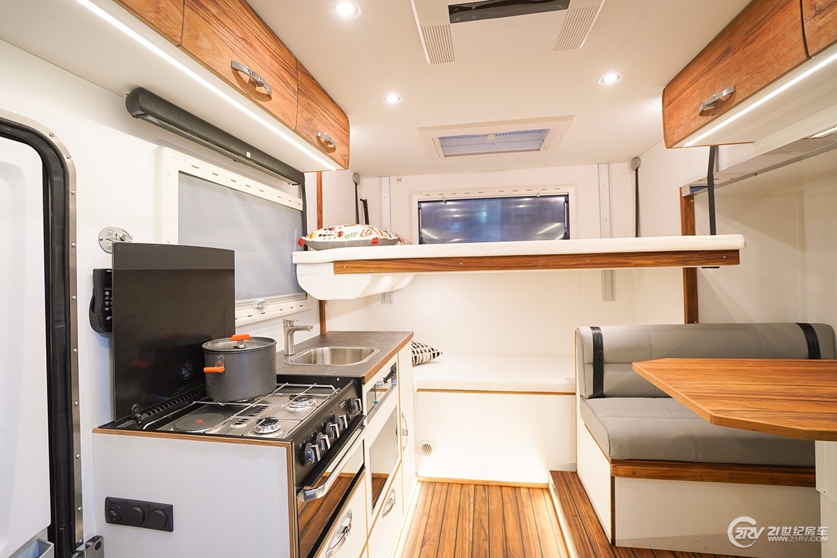 速腾DAILY漫步者四驱越野房车车身整体采用航空铝轻量化车身设计,侧拓式结构设计可拓展出一个会客厅,内部配置一应俱全,进入房车内部,欧式简约风格设计让您感觉到满满的质感,侧拓会客厅可以容纳四人对座式沙发,也可转换成豪华双人床,顶部可升降的德国进口豪华大床可随时根据需求电动升降成双人大床,尾部保留一个单人床可以随时供用户休息。