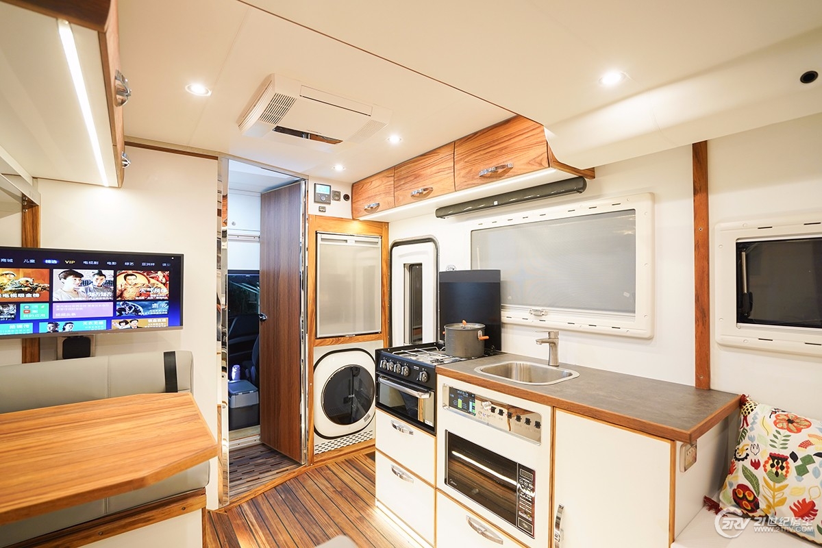 速腾漫步者将空间合理利用到最大化,同时巧妙的利用前车后车通道设计的可干湿分离洗手间,以及房车专用冰箱与烘干一体式洗衣机的双重组合,房车内部整体上以白灰色调为主,搭配游艇实木柚木地板,高端简约。该车标配有:110升多美达冰箱,户外厨房、170升净水箱、50升灰水箱、驻车空调、32寸显示器、卫星天线、2000W冲逆变一体机、400Ah磷酸铁锂电池组、500W太阳能电池等等。