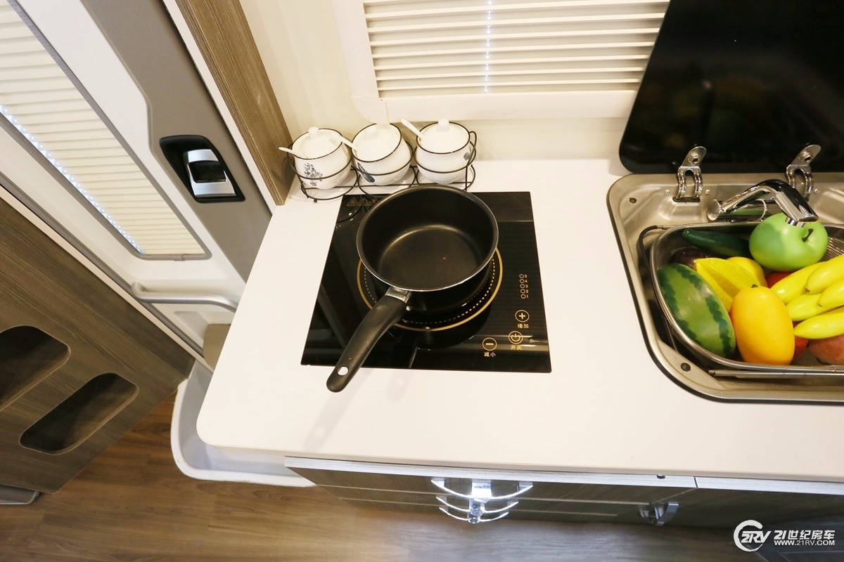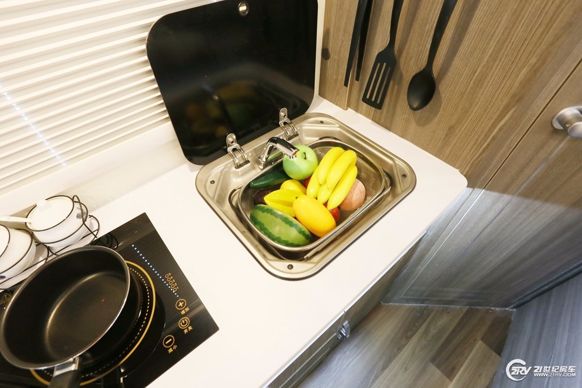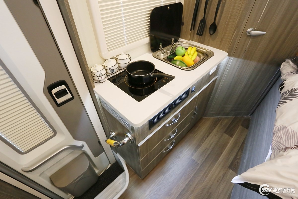 厨房区位于尾床对侧,桌面采用白色长方形设计,干净简洁,上方搭载了电磁炉与带盖板的洗菜池。电磁炉台面面积足够大,满足从小到大不同尺寸锅具的摆放,功率为2000W。洗菜池为带盖板设计,在不用时可与桌面齐平,保持桌面的平整;水龙头也为折叠设计,进一步减少了空间的占用。台面下方是厨房区的储物空间,该处安装了三处抽屉,空间如图所示,在深度以及宽度上均有着不错的表现,可放置炒菜锅、盘碗等物品。右侧储物柜内部空间足够,可容纳大件物品,如大米、面粉等食材。