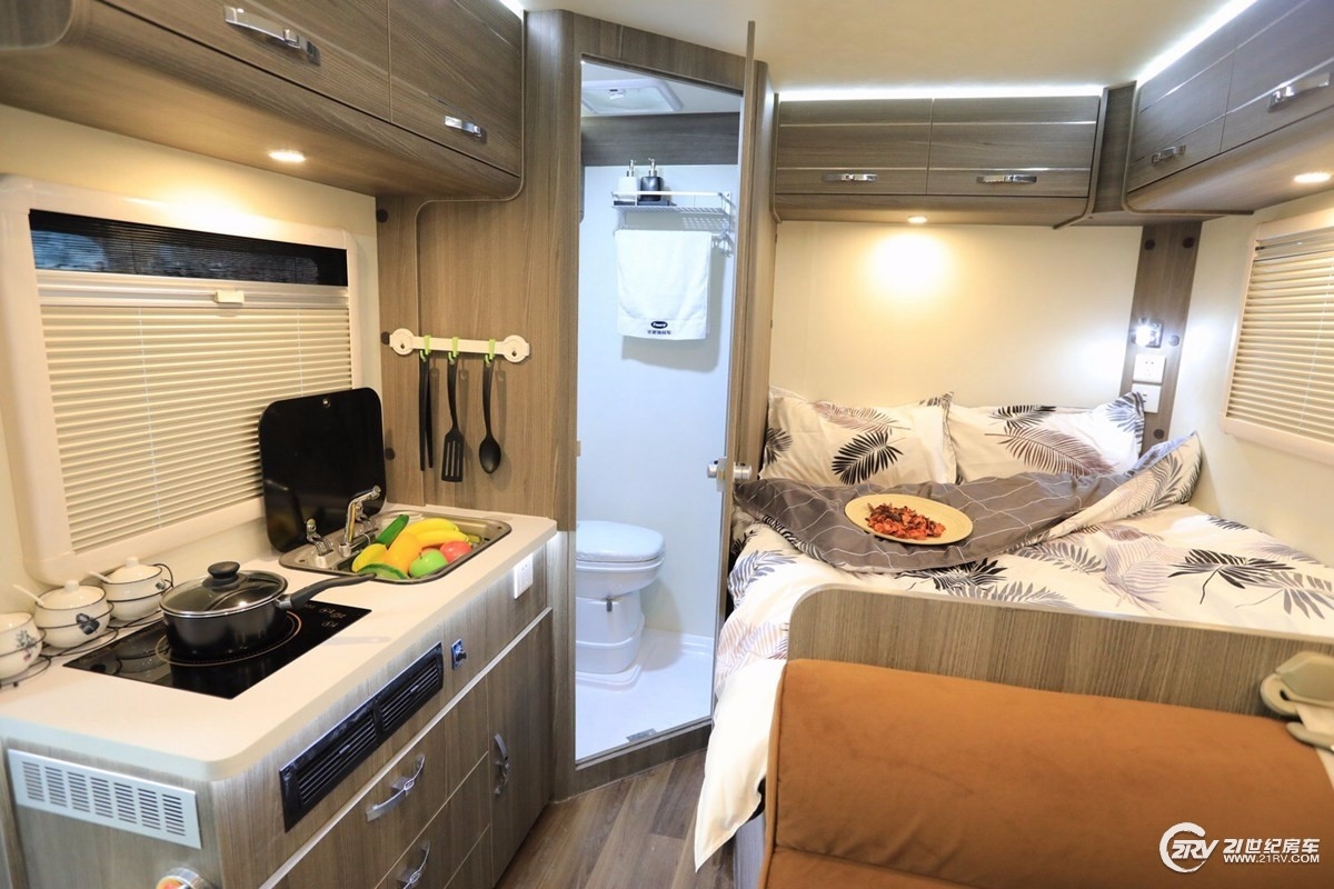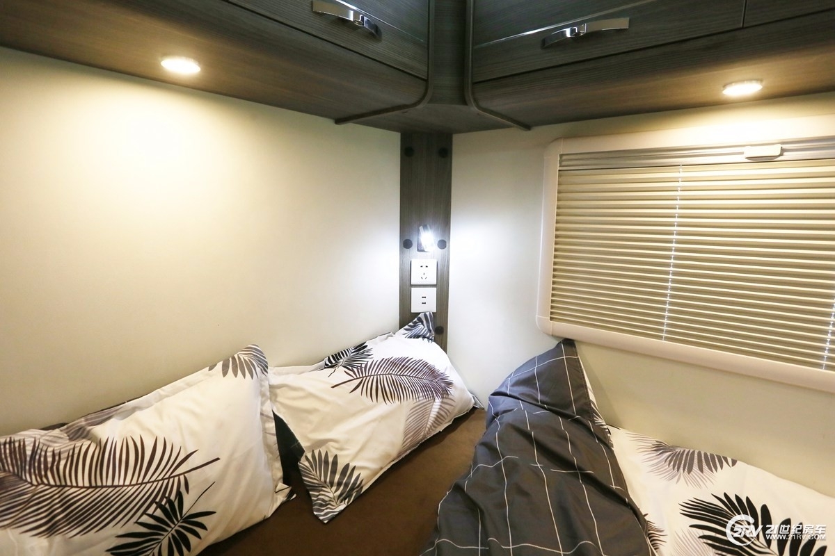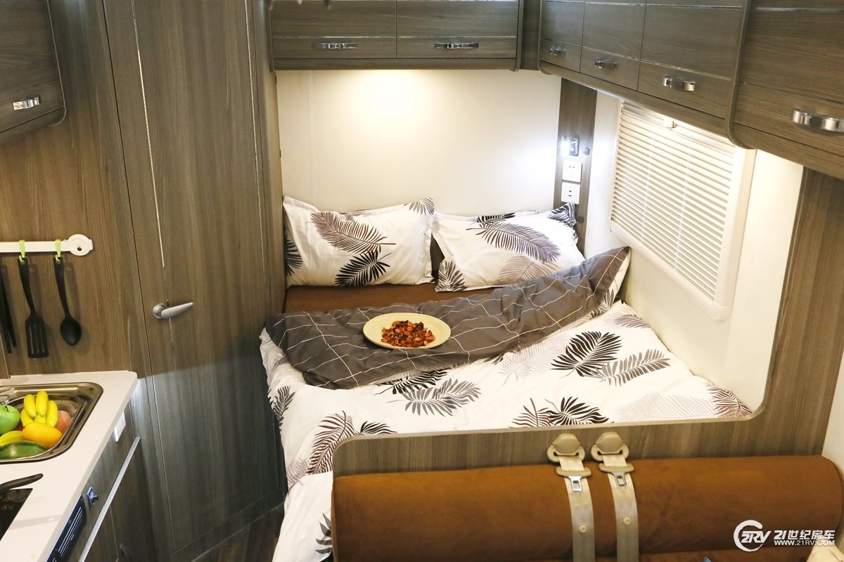 尾床区位于车厢尾部,采用了纵置床设计;床位为舒适双人大床设计,尺寸为1850×1300(mm)。床位上方有五处顶置柜,路途中需要更换的衣物可以轻松的贮存。床头安装了夜灯及220V、5V USB电源插座,方便我们睡眠中对手机等设备进行充电。