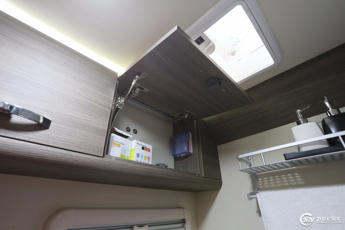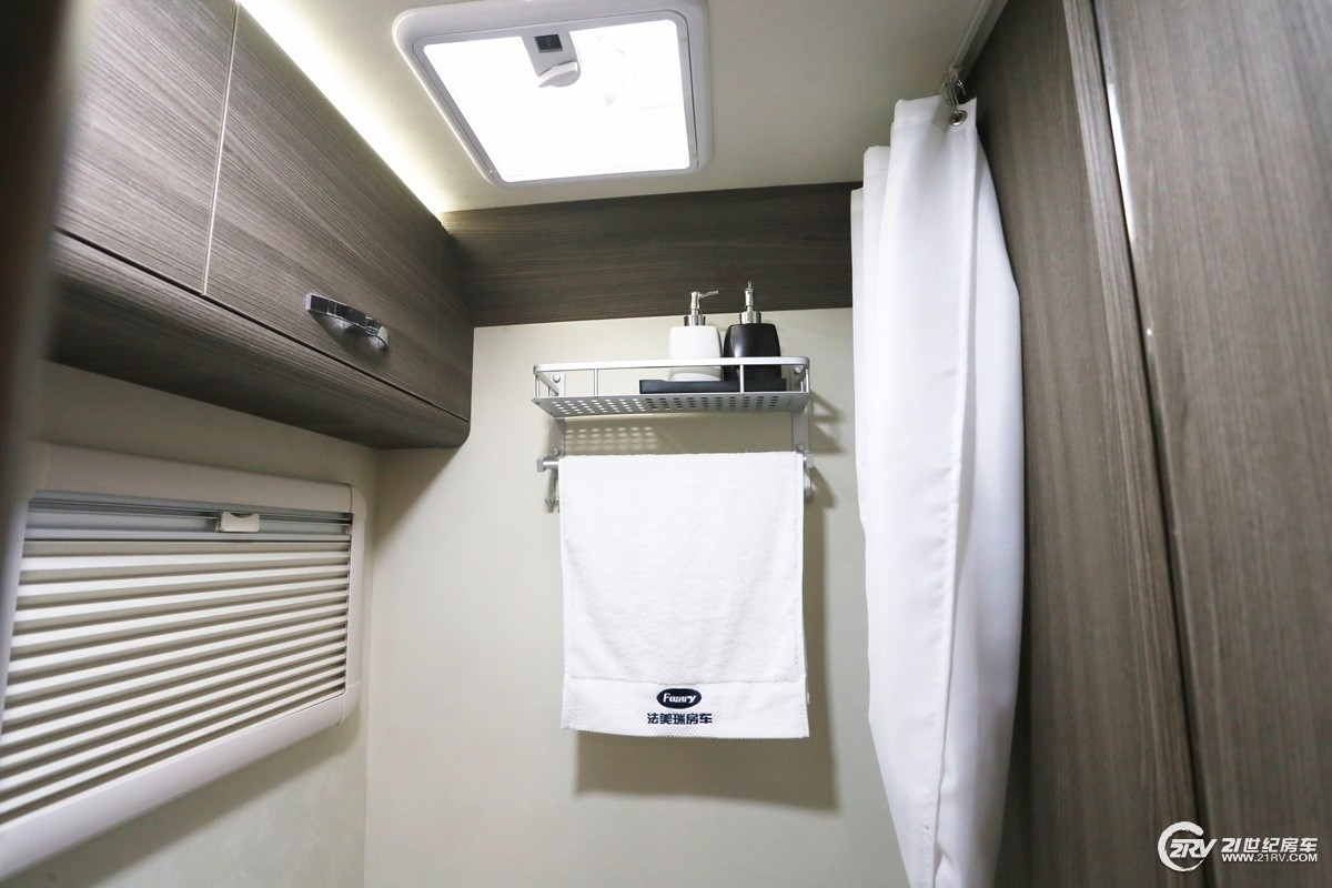 卫生间区位于车辆的尾部区域,内部采用了干湿一体式设计。马桶采用赛特福德可旋转式马桶,在有限的空间内能找到最适合自己的坐姿,同时也能进一步增大淋浴的空间。车辆净水箱容积为180升,灰水箱容积70升。侧面安有带隐私帘与防蚊帘的外推窗。马桶上方装有毛巾与洗发液架子,细节之处想得非常周到。顶置柜可放置随身换下的衣物,空间如图所示;内部还安装了220V电源接口,可接吹风机等电器。顶部装有排气扇,可快速排出卫生间内的异味以及水汽。