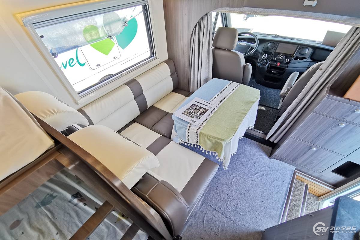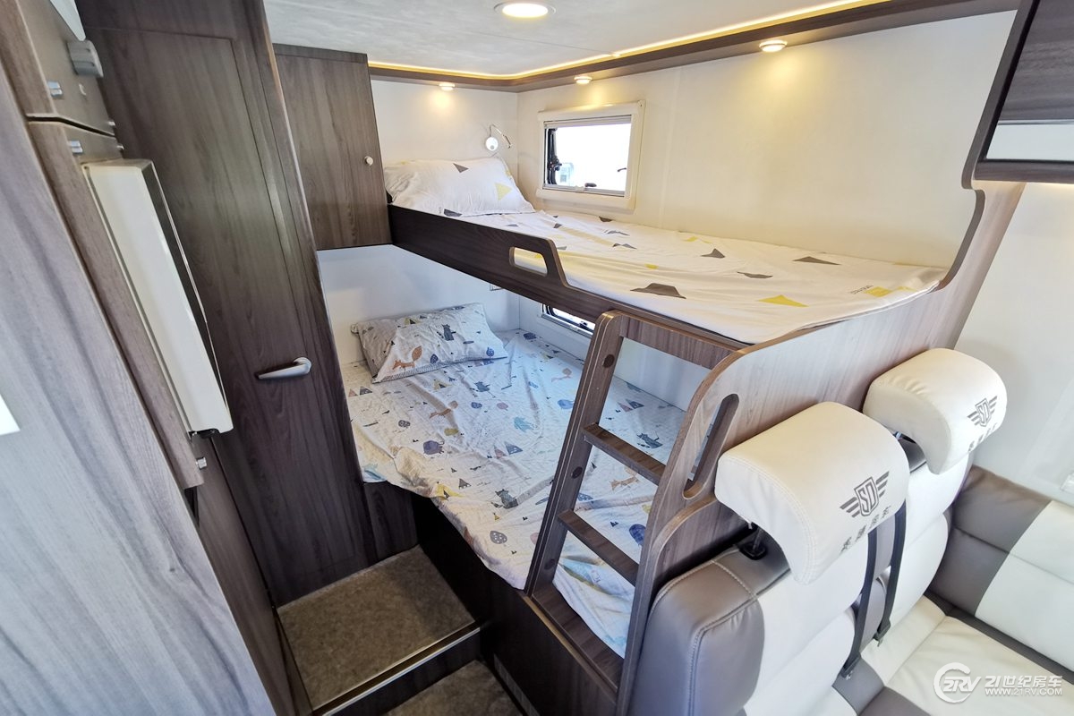 休闲会客区的设计是一个L型的卡座沙发,搭配一张可升降的小桌,临时可拼成一张床,沙发内侧墙壁上有外推窗,推窗上方有储物柜,方便日常使用,车顶有氛围灯。驾驶室上方为额头双人床,两侧设有推窗,能保证额头床区域空气畅通。车尾部纵置上下铺设计,从细节不难看出,上下床铺间安装了爬梯,如此贴心实用的设计让人倍感亲切。整车载客人数为6人。24寸车载电视布置在了乘客门上门,从而免去了将电视集成在额头床板下方时来回翻起床板的麻烦。总控面板位于电视左侧,采用实体按键开关,水箱水位表为机械式。