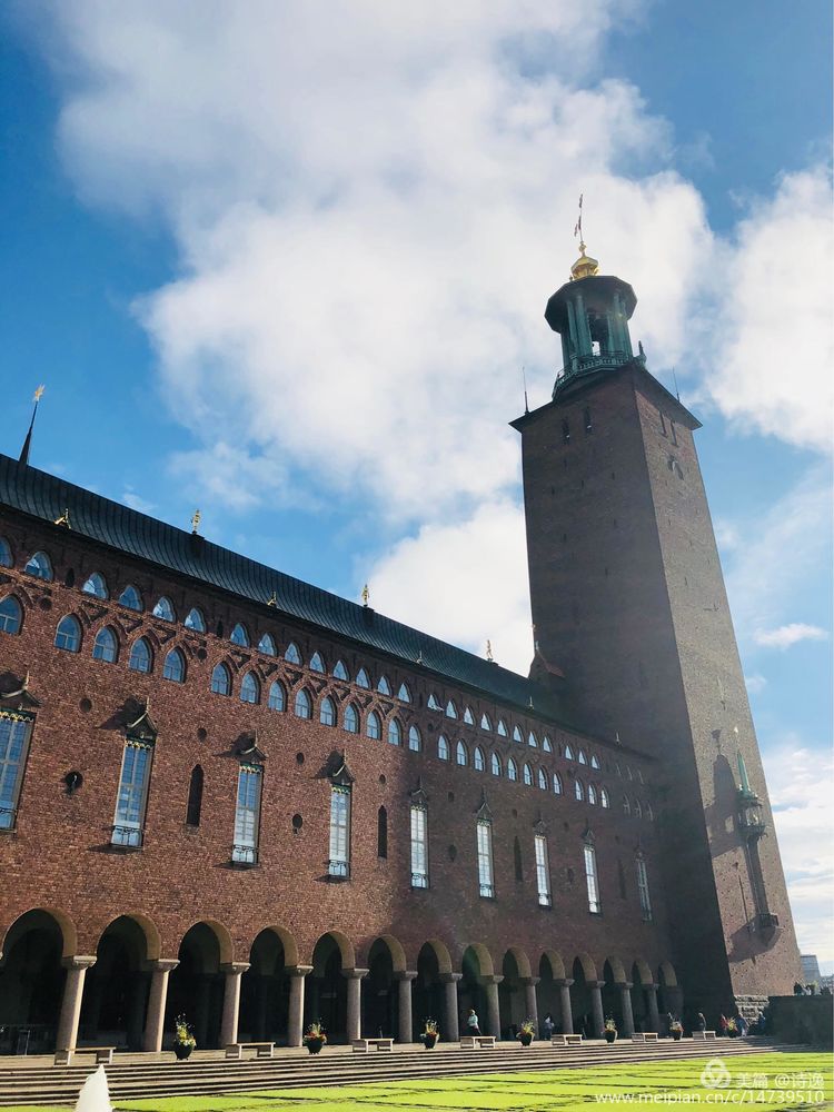 8月12日斯德哥尔摩市政厅位于国王岛(Kungsholmen),历史上的Eldkvarn磨坊曾坐落地方上,现在是瑞典斯德哥尔摩议会的所在建筑物。 市政厅由建筑师Ragnar Östberg设计,并于1911年和1923年间兴建。市政厅是通体棕红色砖结构,大楼被两个大型广场、一个外庭院和一个室内大堂包围,共由8百万块红砖筑成。Ragnar Östberg原本打算把室内大堂设计成蓝色,故把它称为“蓝色大堂”(Blå hallen),但后来他看见美丽的红砖时,便改变主意,不把外墙涂成蓝色了。“蓝色大堂”最著名的活动,莫过于每年12月诺贝尔奖颁奖礼后的晚宴。“金色大堂”有超过1千8百万块玻璃和黄金碎片砌成,可供700人享用宴会。在106米的高塔上,可俯瞰斯德哥尔摩市,塔顶端有瑞典的国家象征“三王冠”标志。