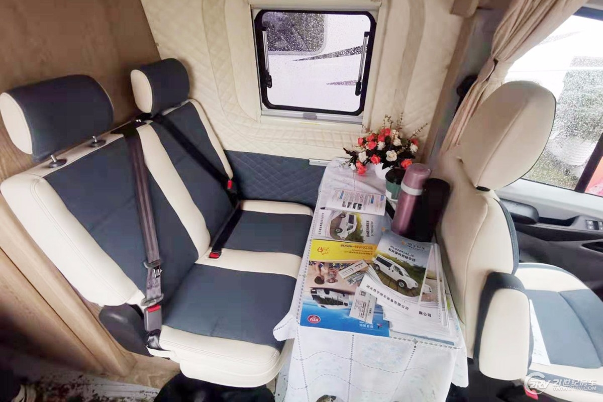 这款车有两种不同的内饰风格,分别是都市风和田园风;上图为田园风,整体内饰简约时尚,采用单排卡座沙发+中置厨房及卫生间+车尾横置上下床的内饰布局设计,休闲会客区采用单排汽车座椅造型设计,旁边设有一个独立座椅,搭配一张小桌;尾部横置卧铺设计,上铺床位尺寸为1650×1030(mm),下铺床位尺寸为1800×1060(mm)。车内配备48V直流变频空调。