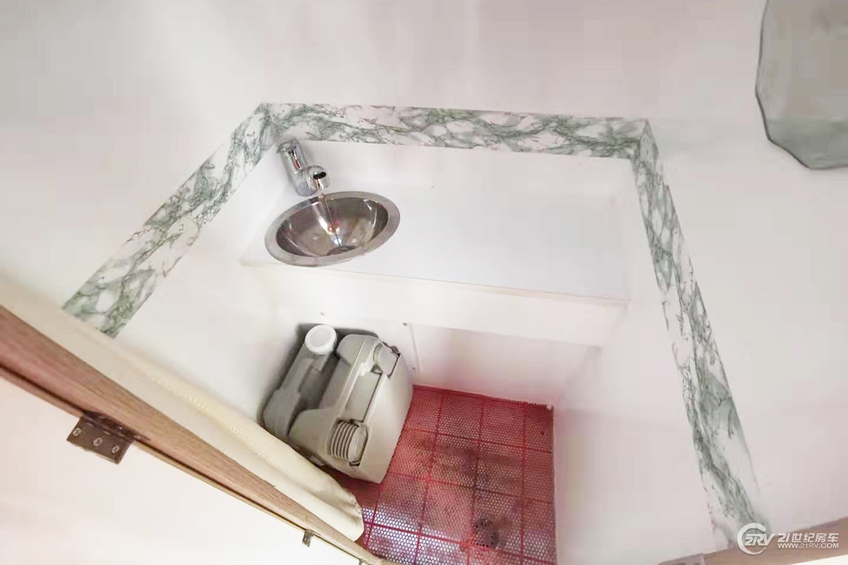 厨房区位于车厢中部,配备不锈钢洗手池、电磁炉、沧浪牌50L车载冰箱等;卫生间设计比较简单,内部配备可移动便携式座便器、不锈钢洗手池等。水路系统方面,净水箱容积为80升、灰水箱容积为60升,此外净水箱容积可升级到120升。