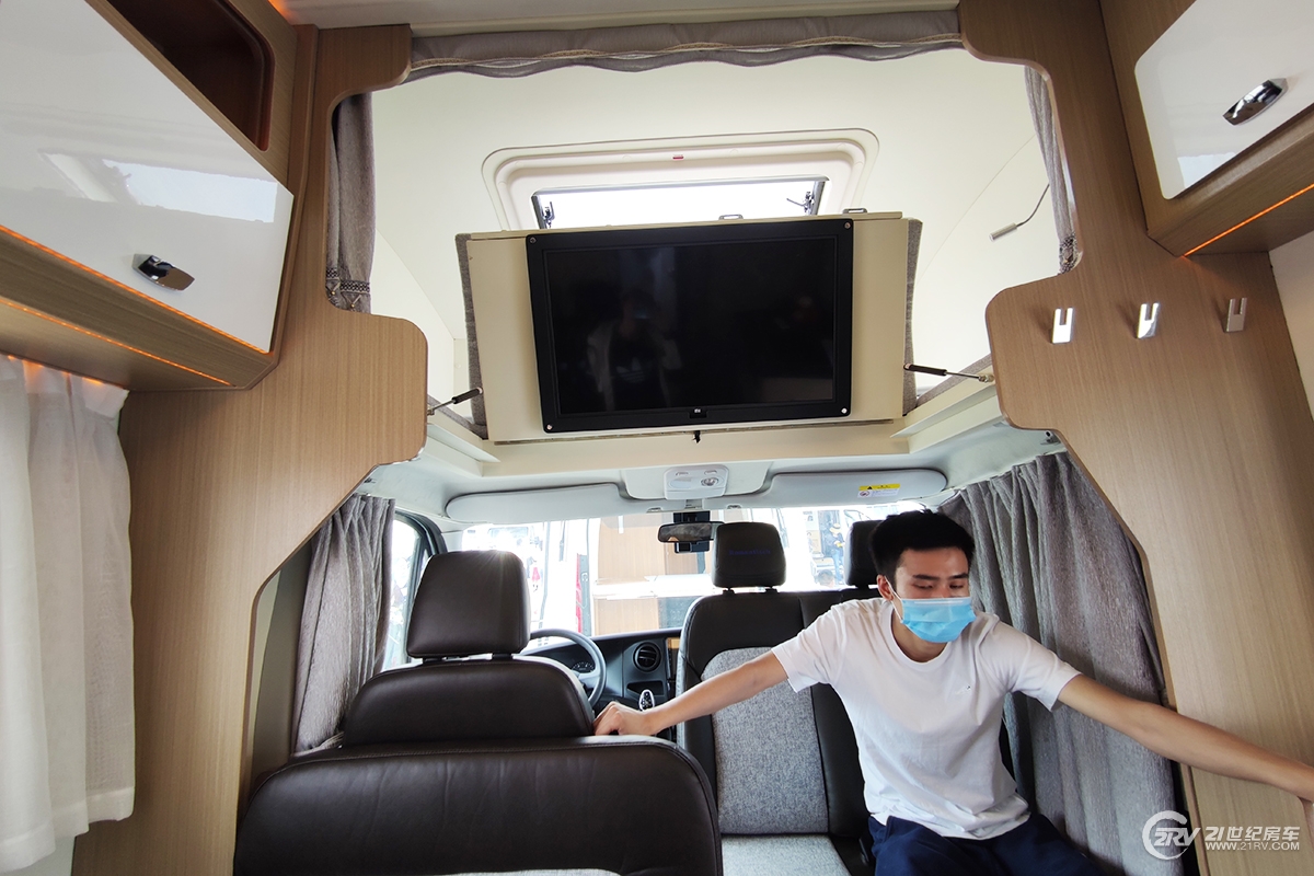 驾驶室上方额头双人床的设计,通过室内爬梯可上下往返,可满足两名乘员休息,顶部及两边配有外推窗,可保证足够的采光及空气流通;额头床翻折起来是一台32寸车载网络电视;音响方面则配备5寸音响系统(双扬声器)。此外驾驶室与车厢之间还配有隐私帘,保证了两边的隐私性。