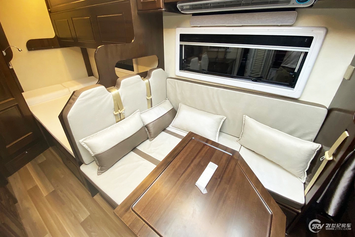整车采用实木家具装修,内外板材均为德国进口朗仕品牌,做工得到了很好的保障。驾驶室副驾驶座椅可向后进行翻转,方便与车内人员交流。上方额头双人床的设计,满足两名乘员休息;顶部配有外推窗,可保证足够的采光及空气流通;额头床翻折起来是一台40寸车载智能电视。此外额头床及驾驶室与车厢之间还配有布艺拉帘,保证了两边的隐私性;休闲会客区采用L型卡座沙发设计,搭配一张德国进口气动升降餐桌(可前后左右移动)临时可拼成沙发床;沙发内侧墙壁上有外推窗,推窗上方配有吊柜,方便日常使用。副驾驶后方配有一台洗衣机。娱乐设备配备有小米音响喇叭等。