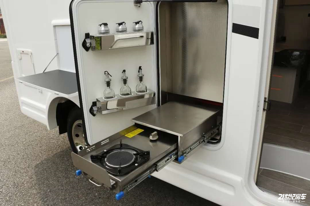 在车辆外部右侧,乘客门后方是一个外置抽拉灶台,高度适中,方便在外出旅行时做一些比较丰盛的饭菜。抽拉灶舱门内侧还贴心的设计了一个调料罐摆放区,可以放置油盐酱醋等调料罐。舱门后方还有一个小置物板,可以放置做饭前准备的食材和做好的美食。