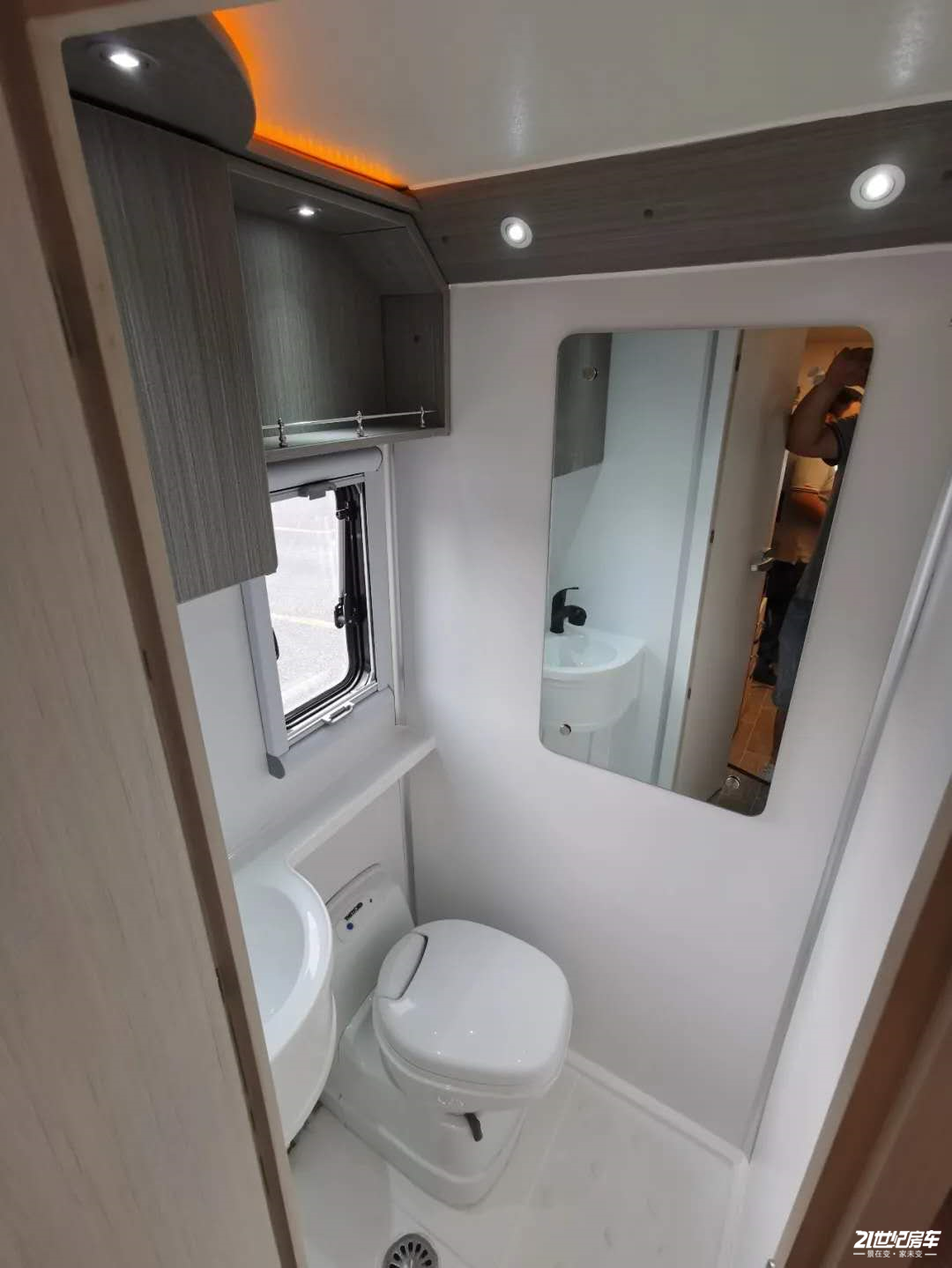 卫生间位于车尾处,采用干湿一体式设计,空间适中,配有赛特福德可旋转抽拉式马桶、洗面池、抽拉两用的水龙头、洗漱用品摆放台、大尺寸梳妆镜、储物格等。