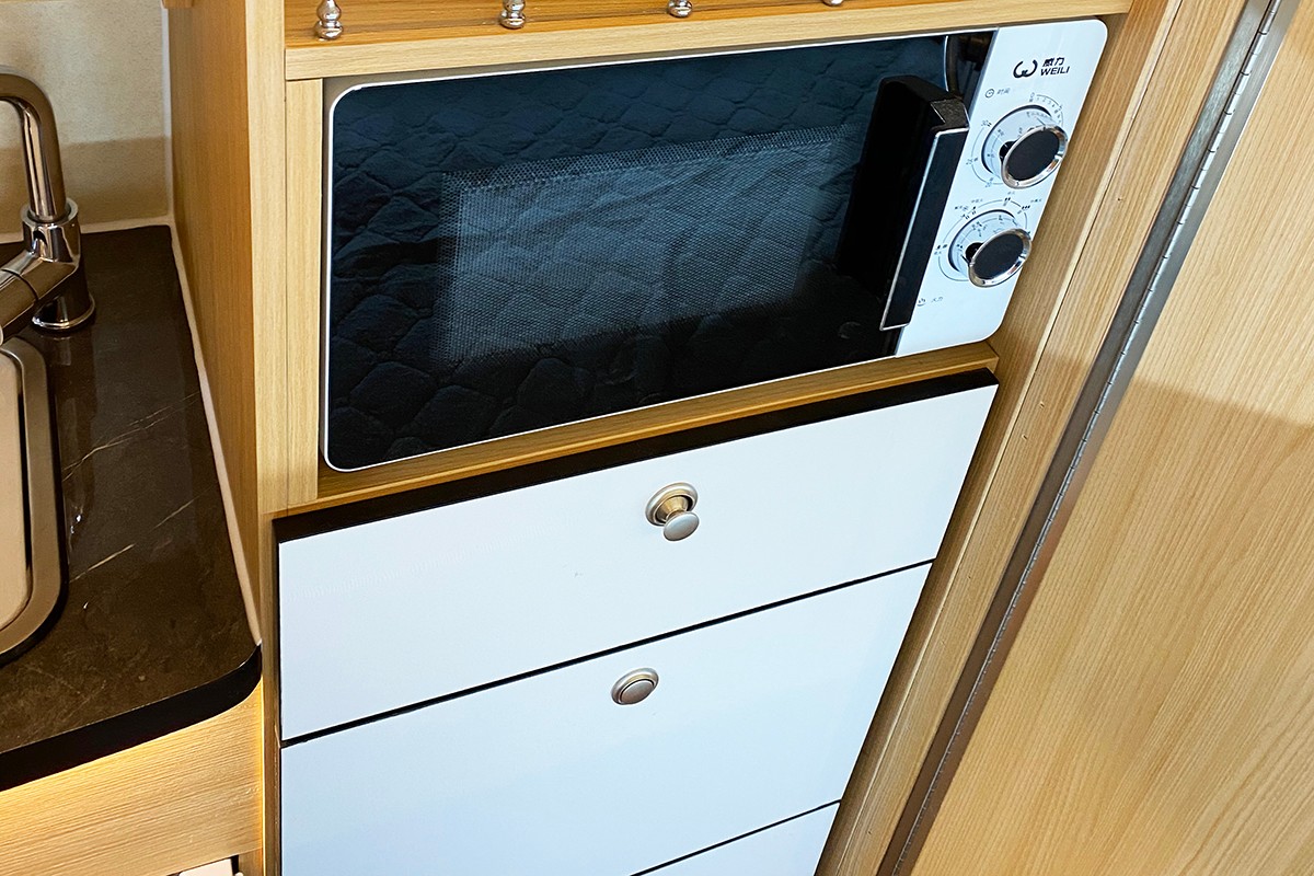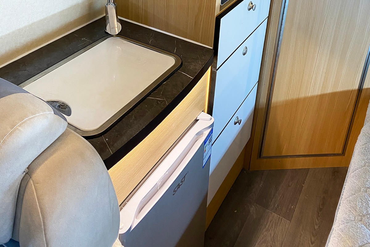在上下床的对面是厨房区,一体式的厨台上设有带盖洗菜池,方便洗菜切菜,下方是一个71L车载冰箱,厨台的旁边是嵌入式的微波炉及储物柜,方便存放日常的厨房用品。