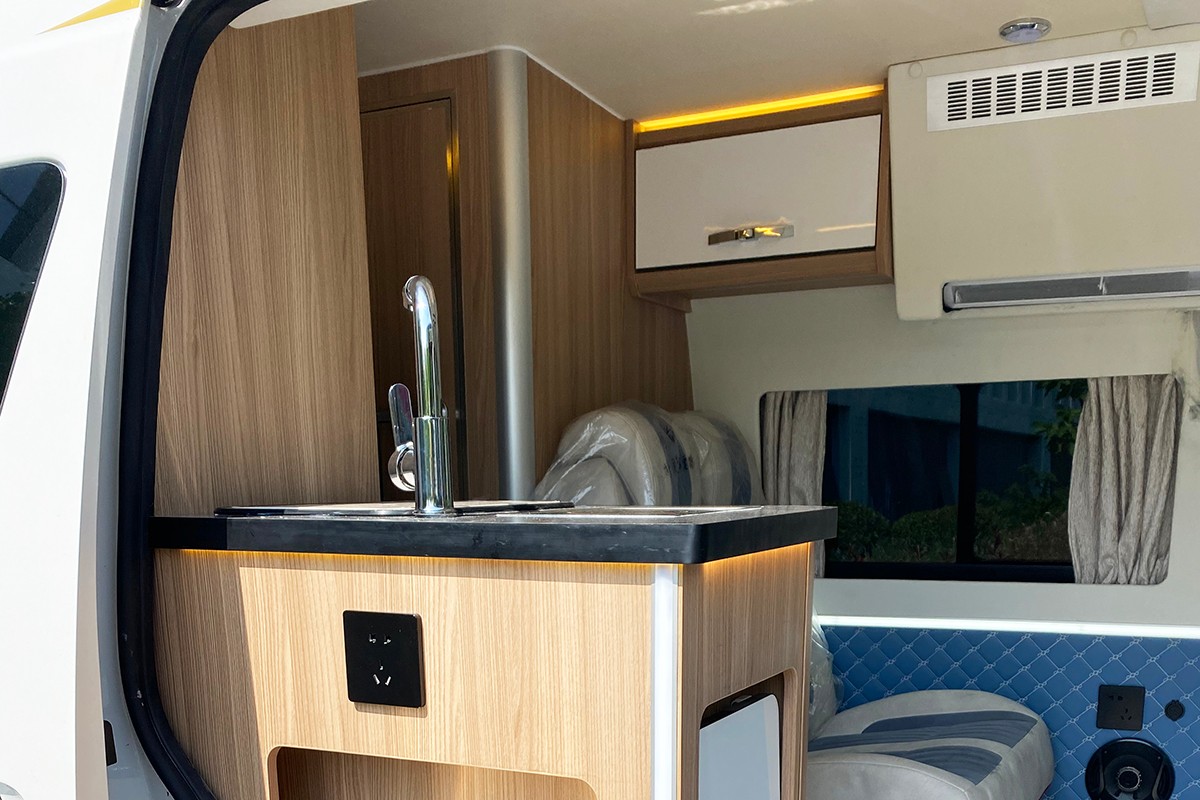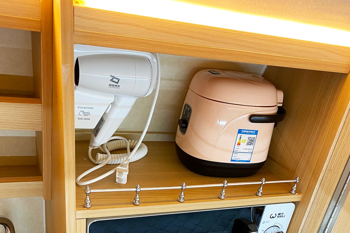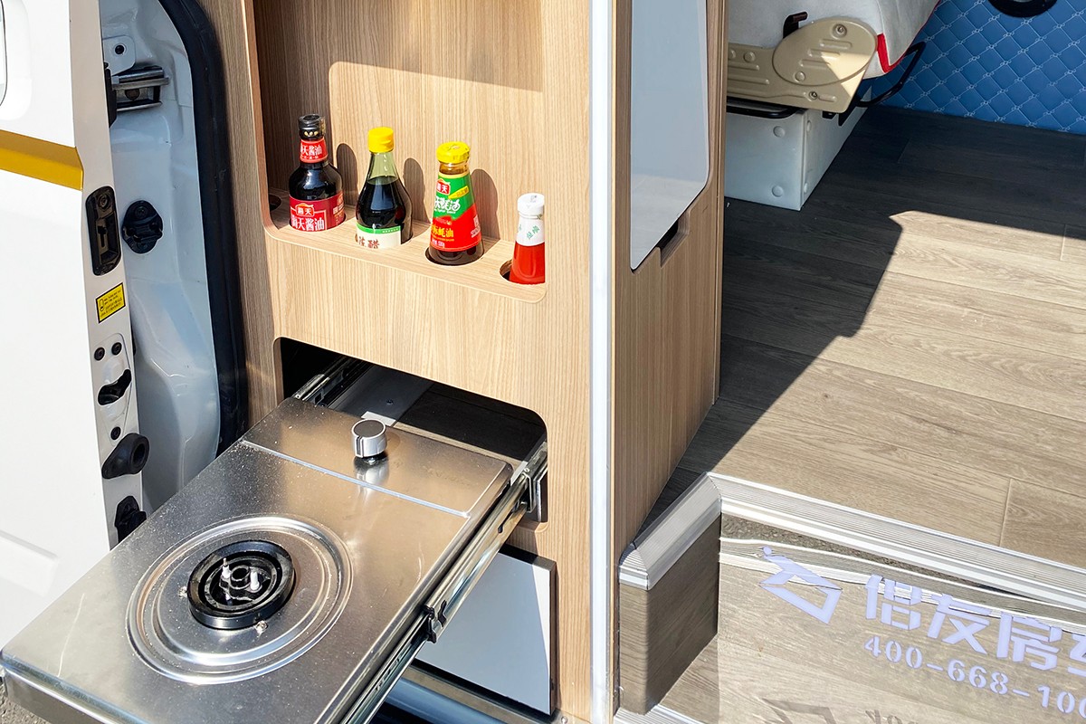车内板材与上下铺5座版一样采用E0级环保板材。不同之处是,取消了单人独立座椅,使厨房区前移,外侧抽拉式的燃气灶上方是调味料储物格,方便烹饪拿取,同时,还配备了220V五孔插座,厨台上配有带盖式不锈钢洗手池、电磁炉,旁边是储物柜,柜内嵌入有威力迷你微波炉及71L车载冰箱。