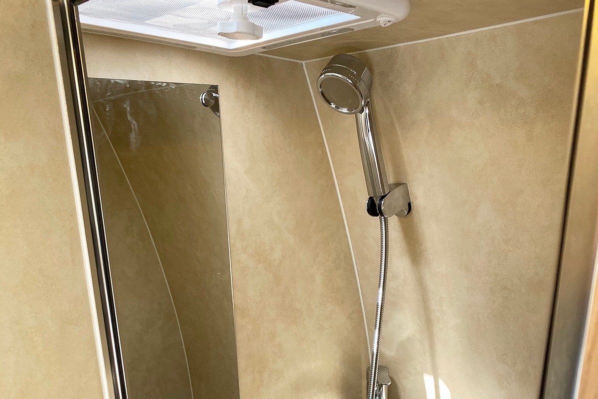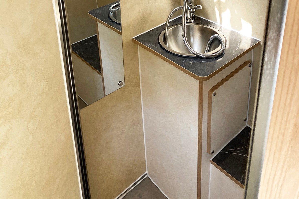 卫生间位于车厢尾部,内部采用干湿一体式设计,配备便携式座便器、不锈钢洗手池、梳妆镜、换气扇及房车专用淋浴花洒等。