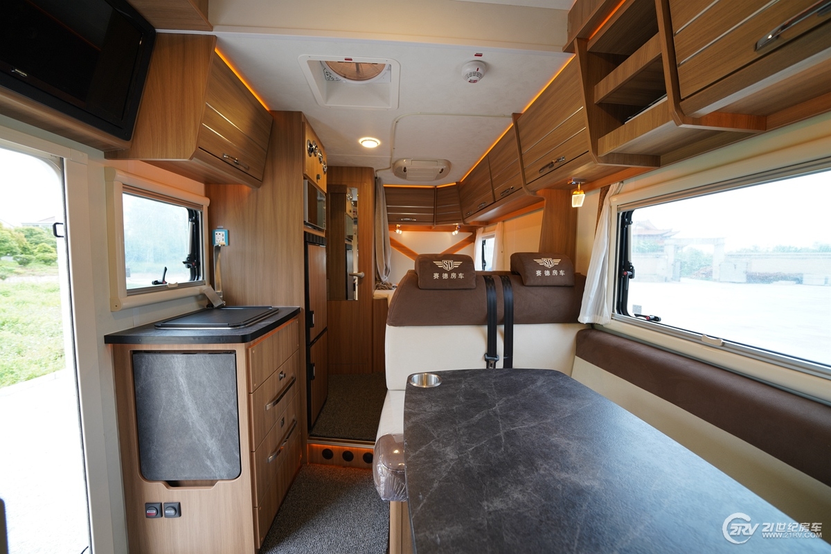 厨房区位于车厢中部,配有带盖式不锈钢洗手池、微波炉及148L弗罗斯特双开门车载冰箱等;电器方面配备伟巴斯特热水暖风系统及驻车冷暖空调等。