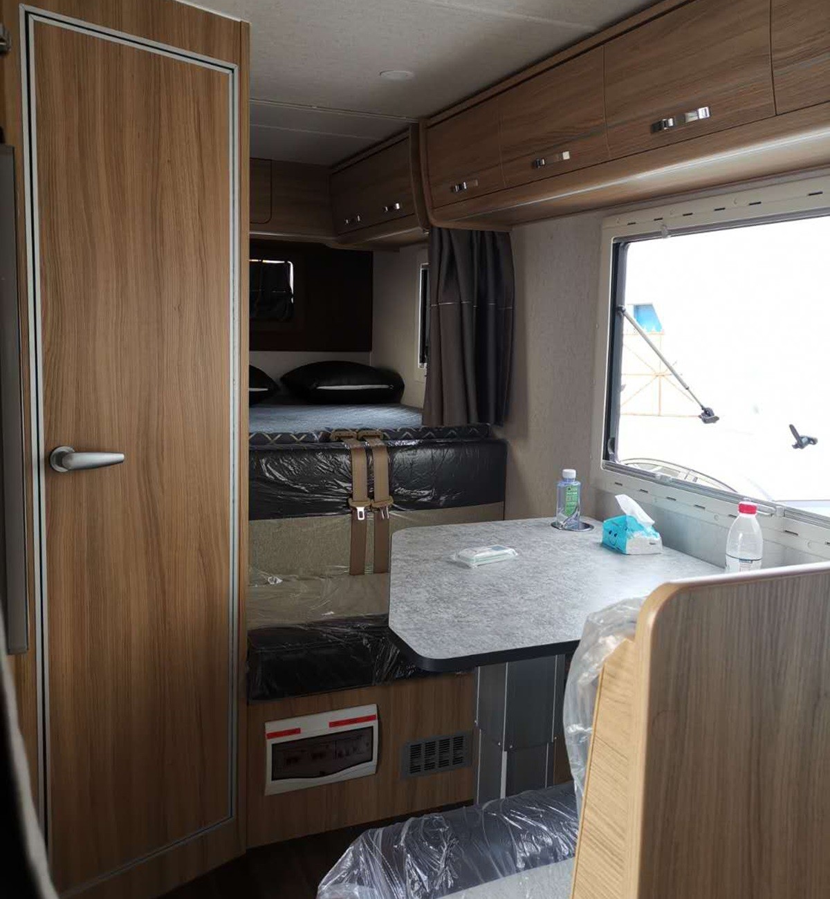 车内布局方面,该车从前至后分别为驾驶区、会客区、厨房区、卫生间和车尾床。会客区采用对卡座+电动升降桌布局,夜晚将电动升降桌降下可拼成一张单人床。会客区上方配备了一台家用变频空调。