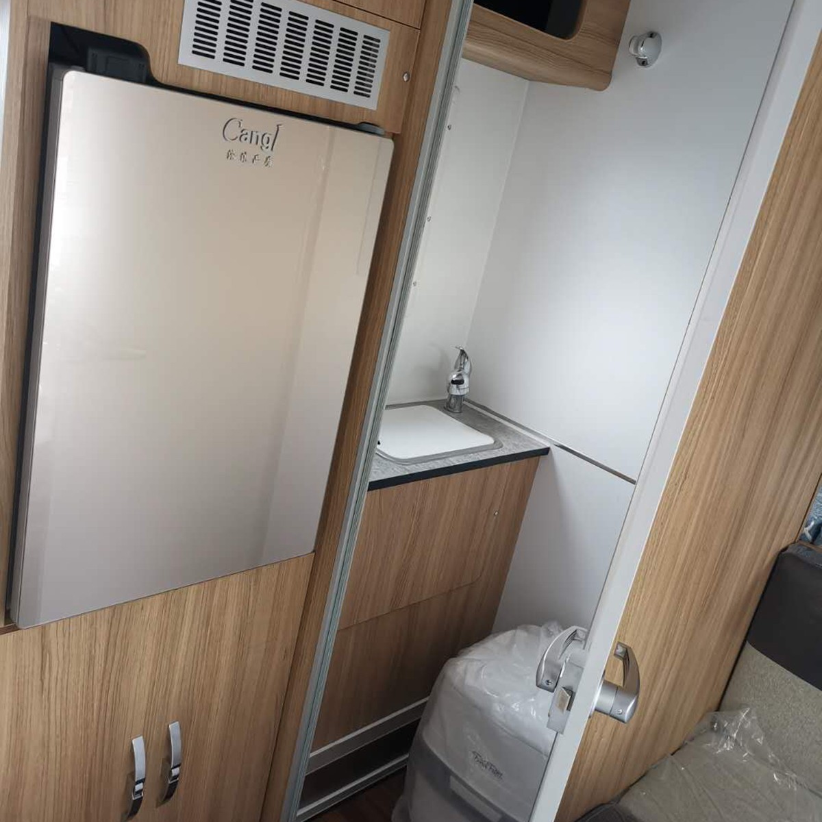 会客区旁边是厨房区和卫生间,厨房区配备了800W电磁炉、沧浪12V 50L房车专用冰箱。卫生间配有洗脸池、两用式抽拉淋浴花洒、便携式马桶、换气扇等。