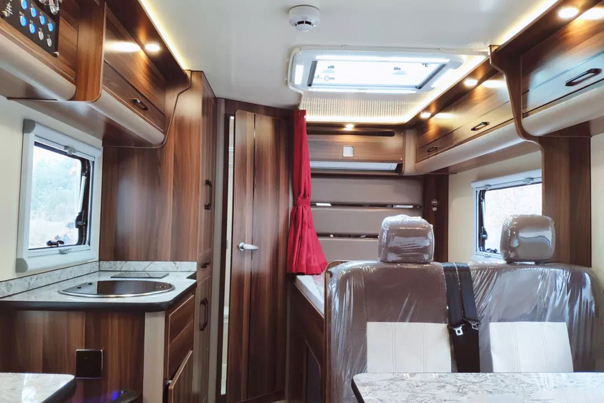 车内采用额头双人床+卡座沙发+车尾纵置双人床的内饰布局设计,此外还可根据个人喜好进行定制;休闲会客区采用对坐式卡座沙发设计,搭配一张可升降桌,临时可拼成一张尺寸为1600×1150(mm)的沙发床,沙发内侧墙壁上有外推窗。上方配有一台家用1P变频空调,可提供良好的居住舒适感。