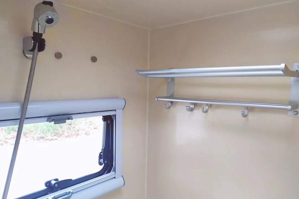 卫生间采用干湿一体式设计,内部配备赛特福德可旋转盒式座便器、洗手池、双向换气扇、抽拉式一体式淋浴花洒等。水路系统方面,130升净水箱(冷)+70升净水箱(热)、60升灰水箱。(注:图片来源由凤凰房车提供)