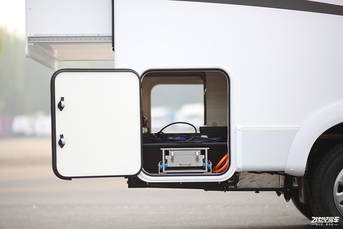 车尾部分是贯通式储物舱,且内侧带有照明灯。车身左侧其余则是黑水箱口,注水口和市电接口。