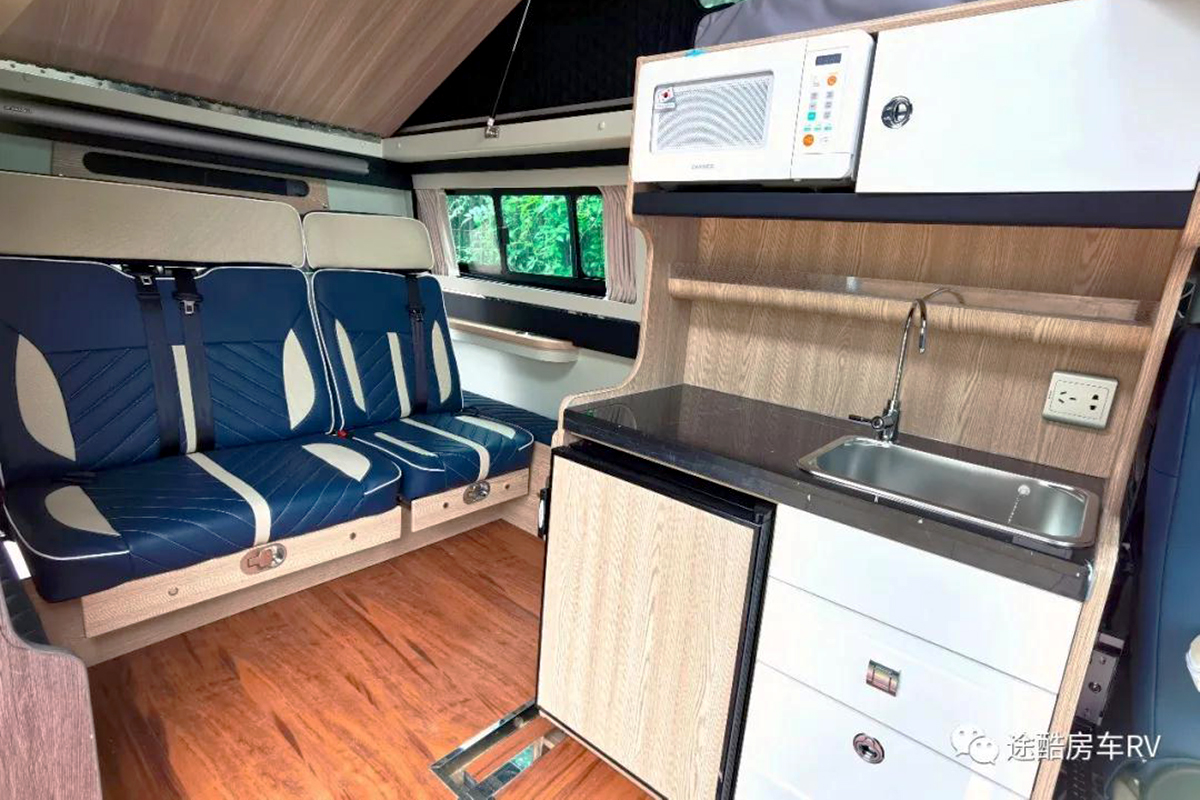 车内亮点十足,厨房区位于车厢中部,配备微波炉、12V 72L车载冰箱(冷藏冷冻可分区);周围配有多组储物柜及一组220V电源插座。上装饰吊柜配有温馨的黄色灯带。